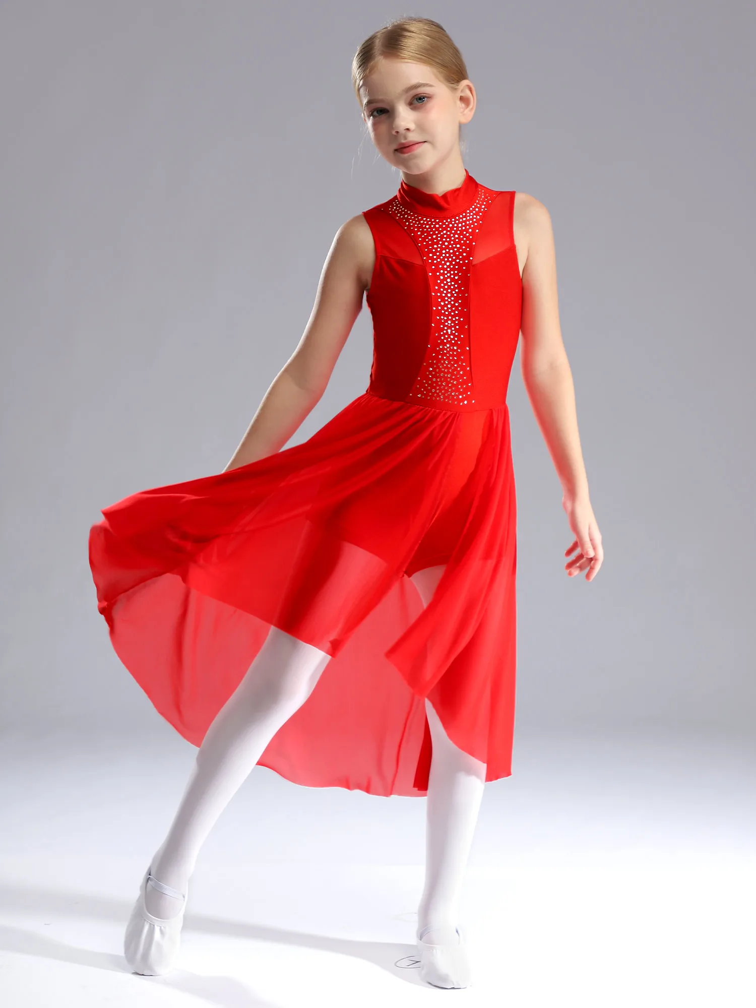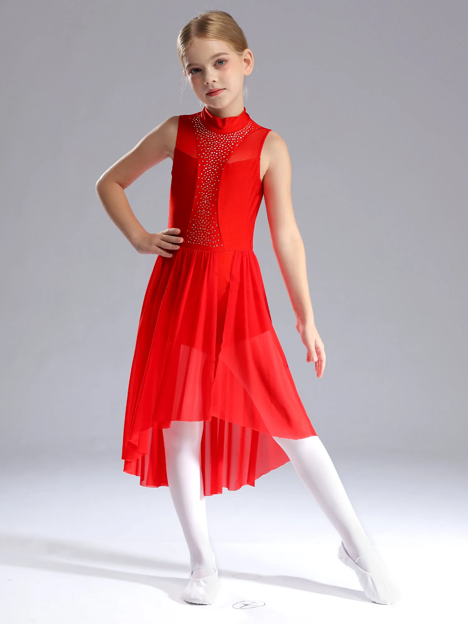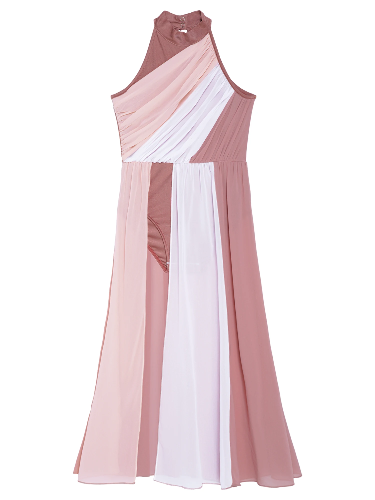 Sleeveless dance dress for girls, cutout back design, mock neck with press buttons closure for easy wearing.