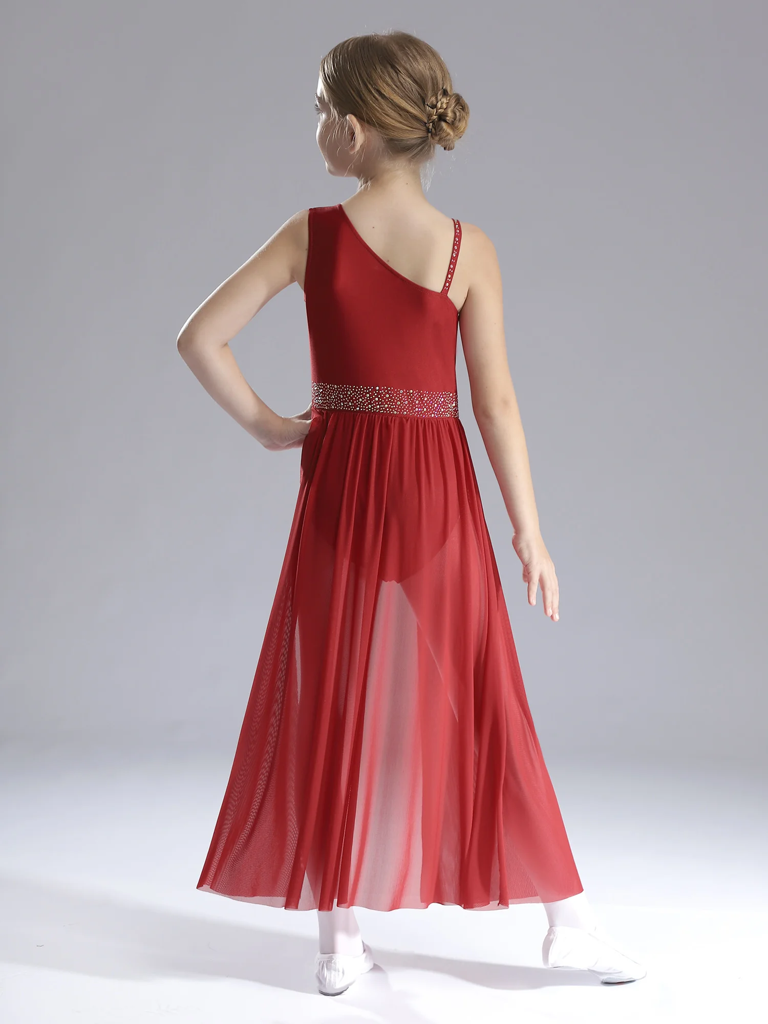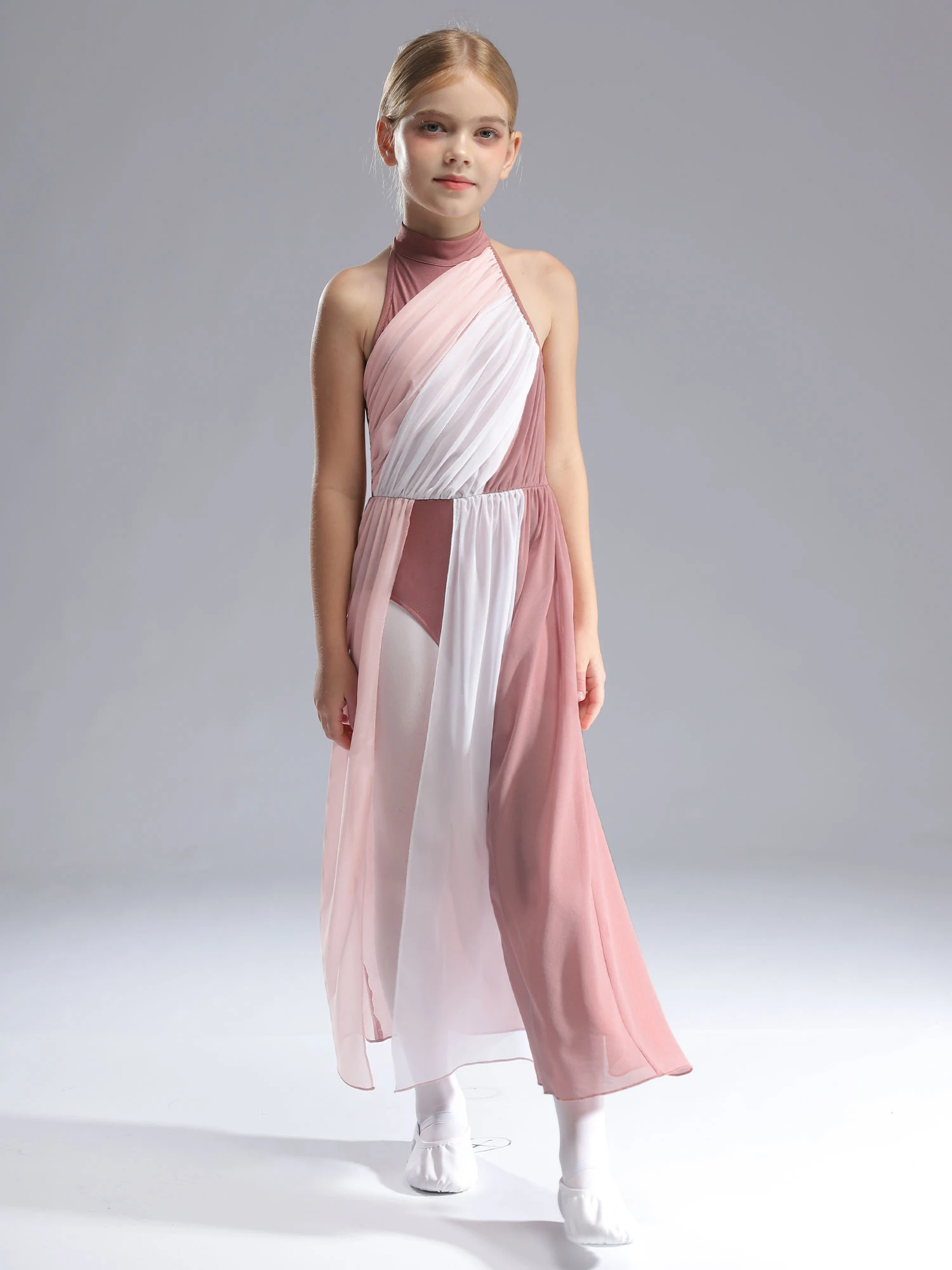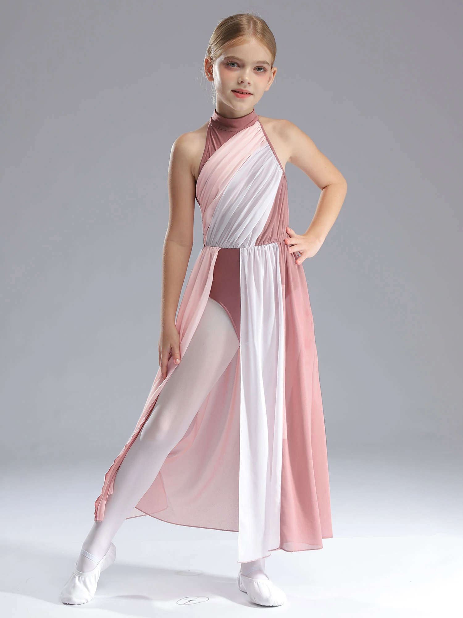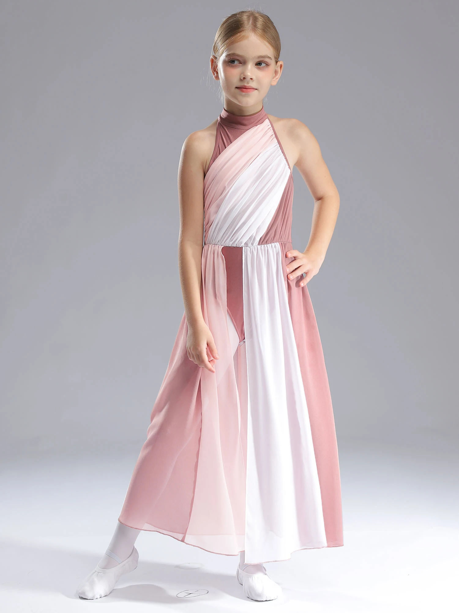 Sleeveless dance dress for girls, cutout back design, mock neck with press buttons closure for easy wearing.