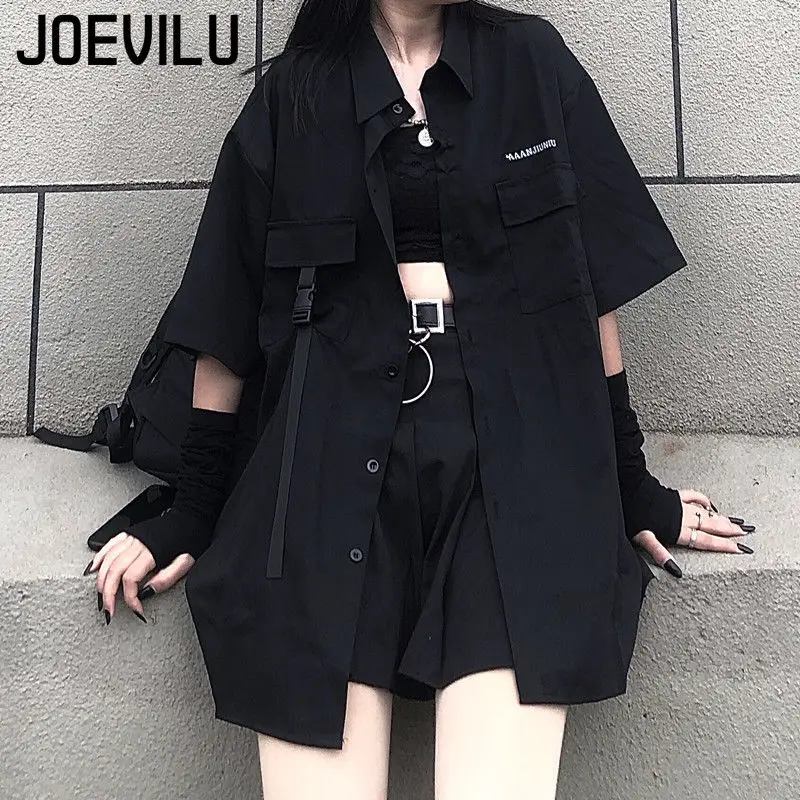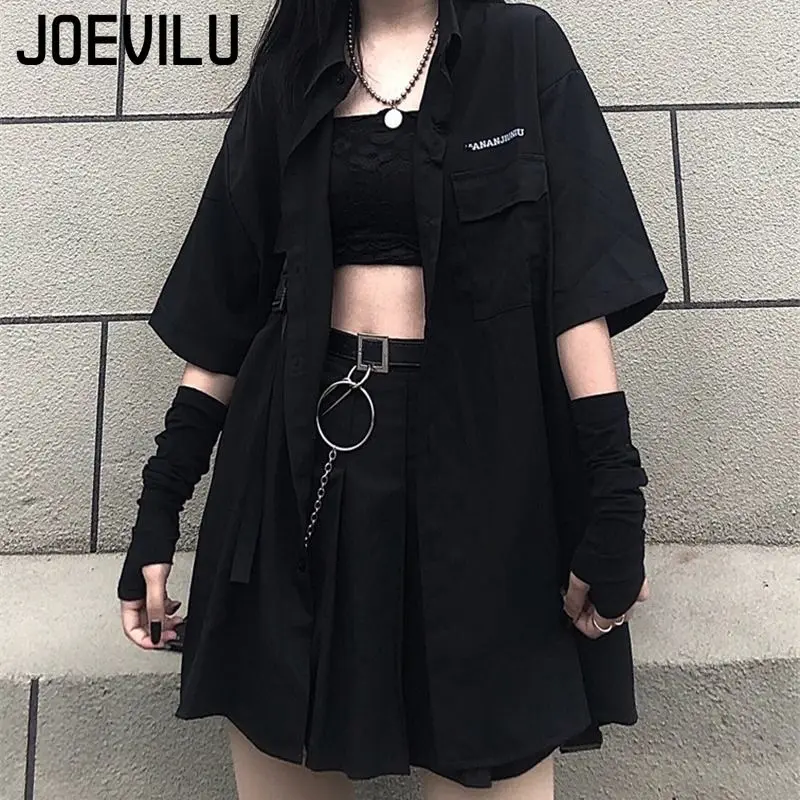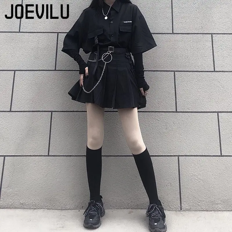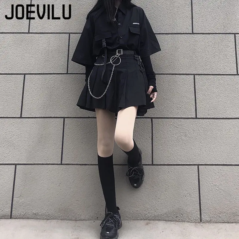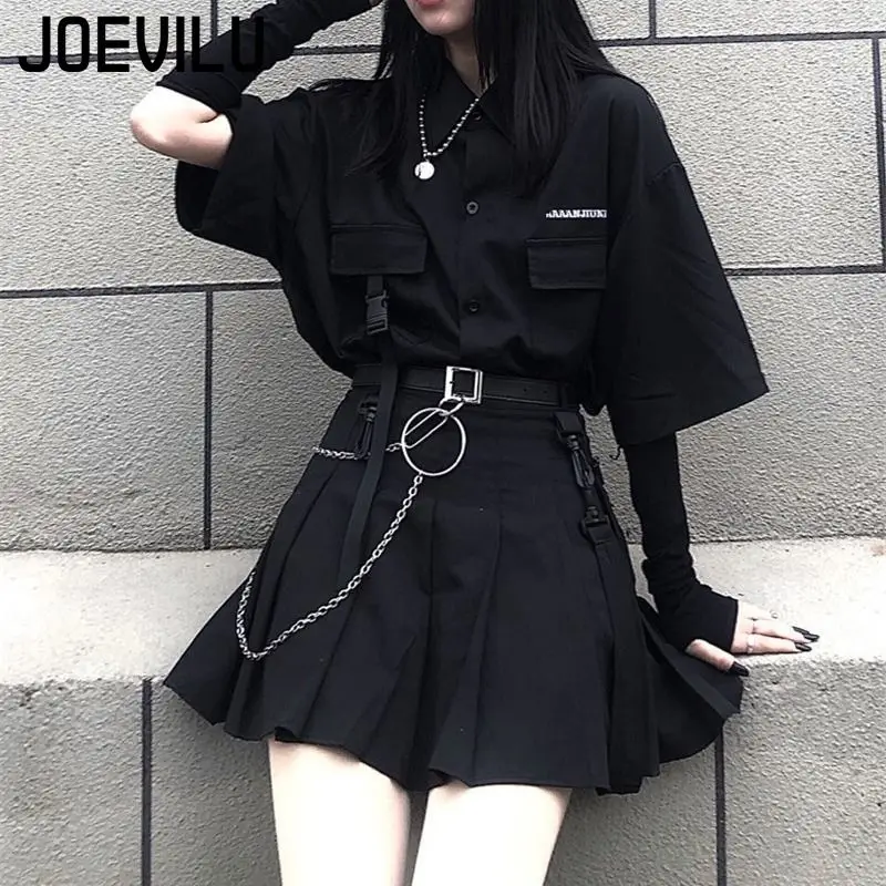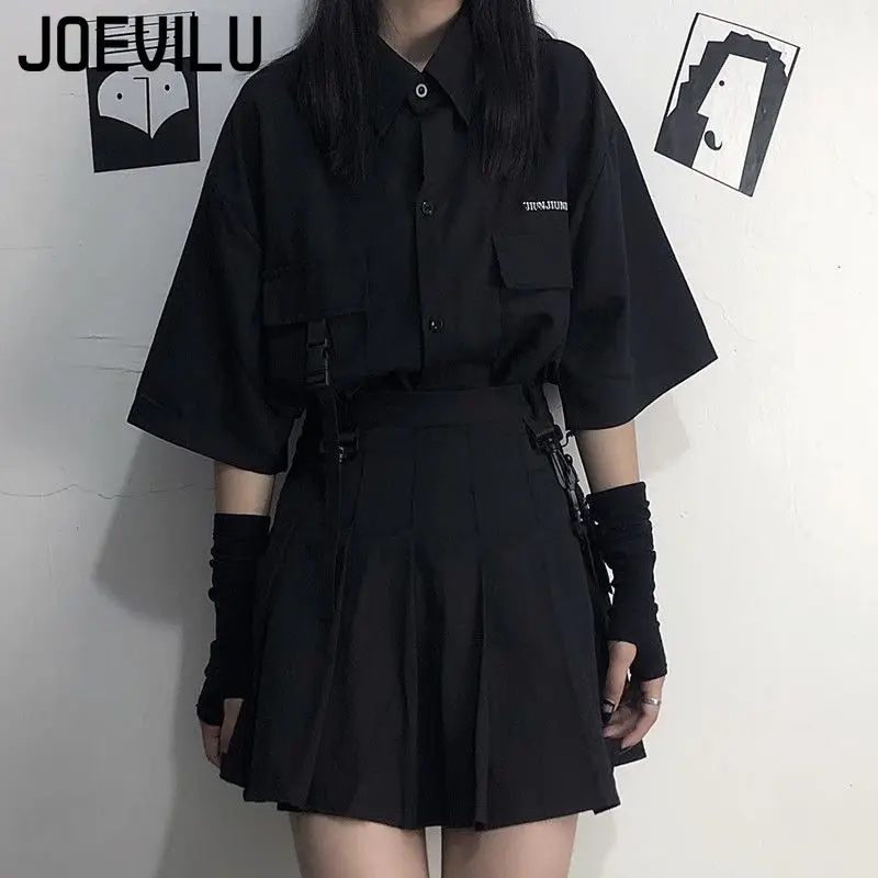 Gothic Skirt Set Loose Shirt Pleated Mini Skirts 2 Piece Sets Korean Retro Casual Outfits Women Spring Summer Aesthetic Y2k Suit