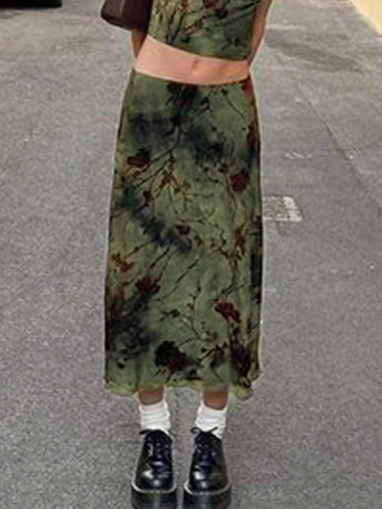 Harajuku Floral Print Long Skirt Vintage Low Rise Straight Midi Skirts for Women Autumn Basic All-match Skirts Ladies Y2k