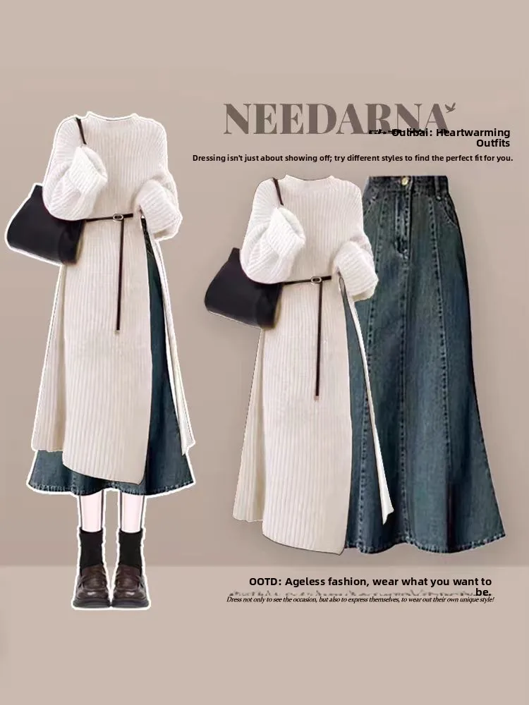 The two-piece set includes a knit sweater and a denim skirt, offering versatility in styling and pairing with other garments.