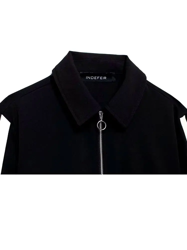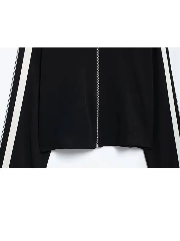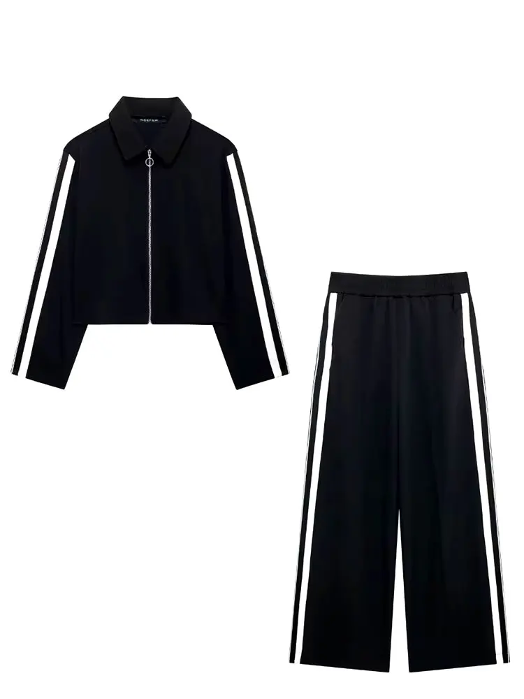 HH 2024 Female Street Trendy Trousers Suits Lapel Zipper Cropped Jackets+Elastic Waist Wide Leg Long Pants Causal Autumn Set