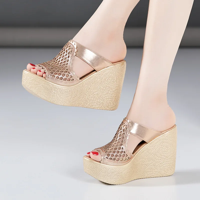 High quality wedge sandals for women 8cm 11cm high heel 2025 summer size 32 33 42 43 platform open toe fashion shoe black gold