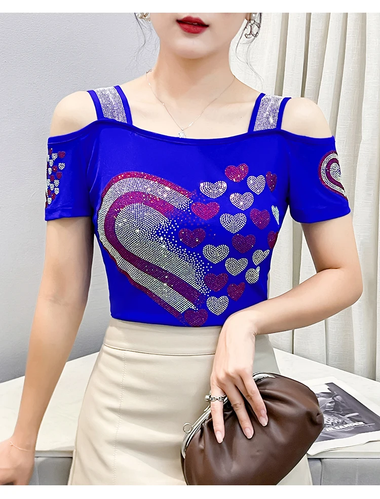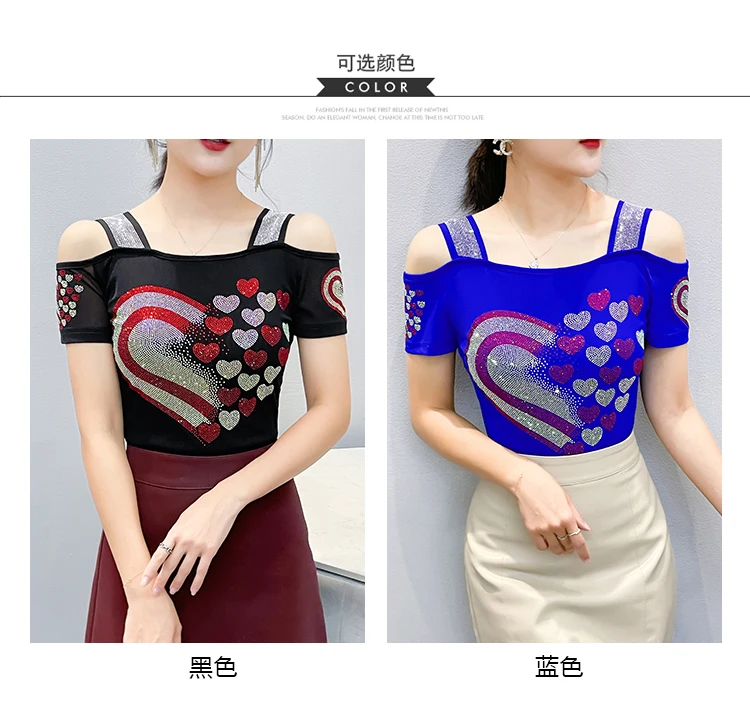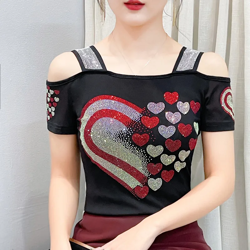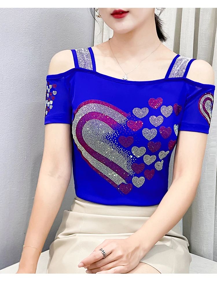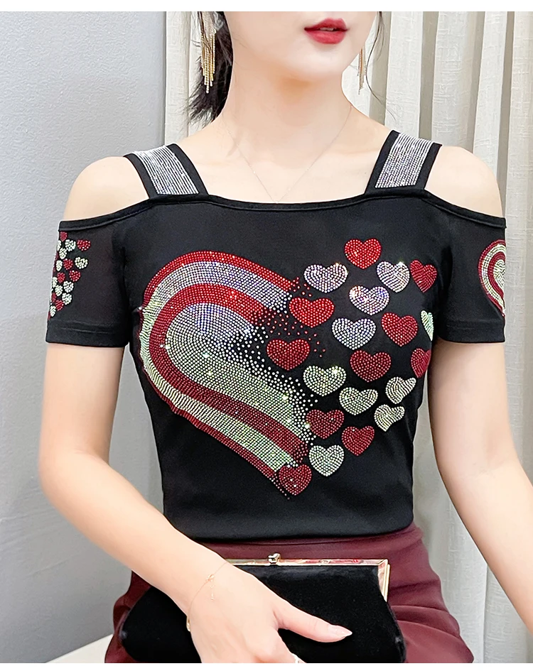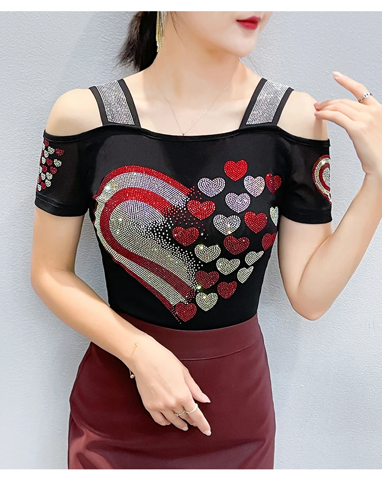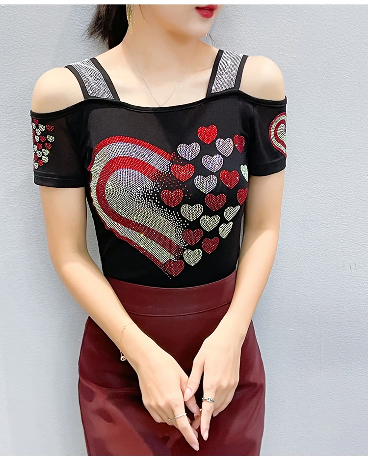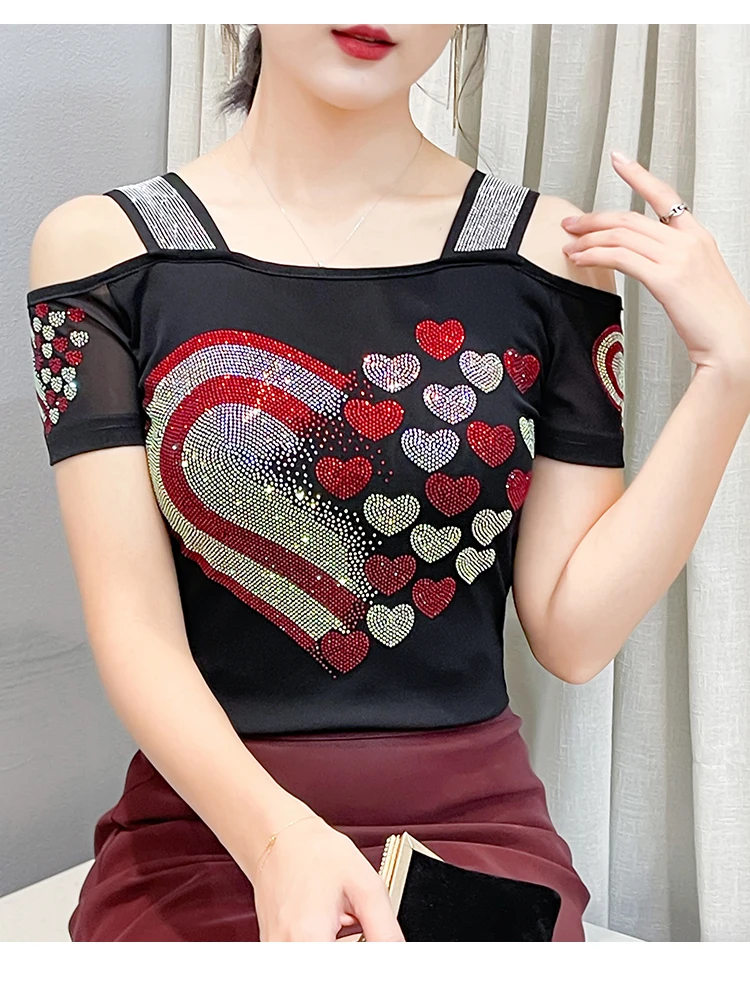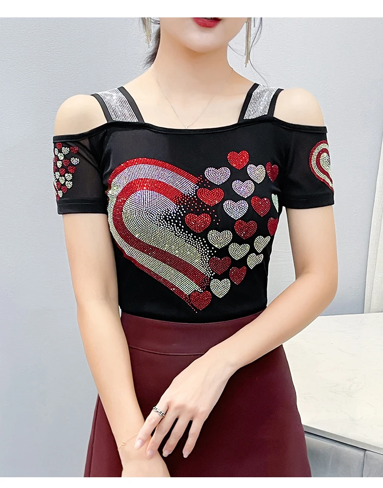 High Quality Women Short Sleeve Mesh Tees Clothes Luxury Love Heart Shiny Diamonds Summer T-Shirt Female Streetwear Fashion Tops