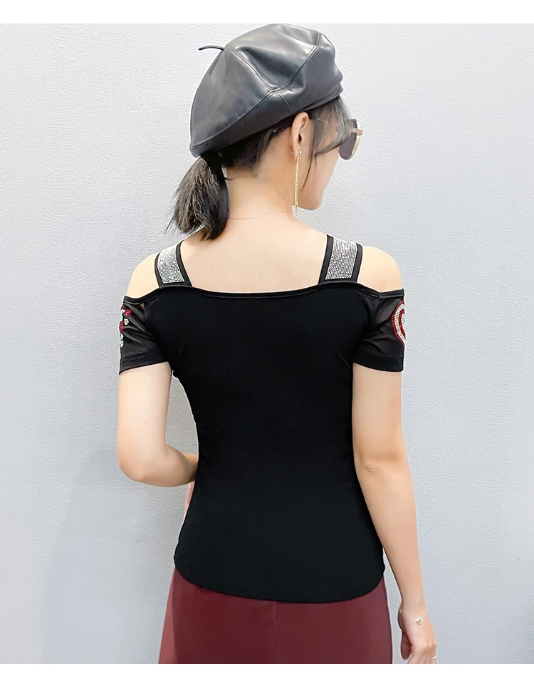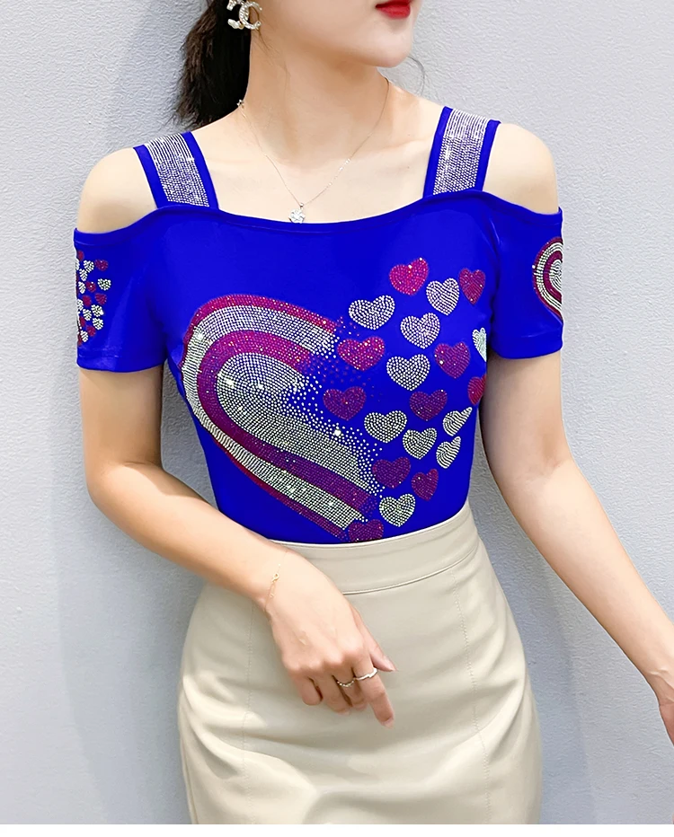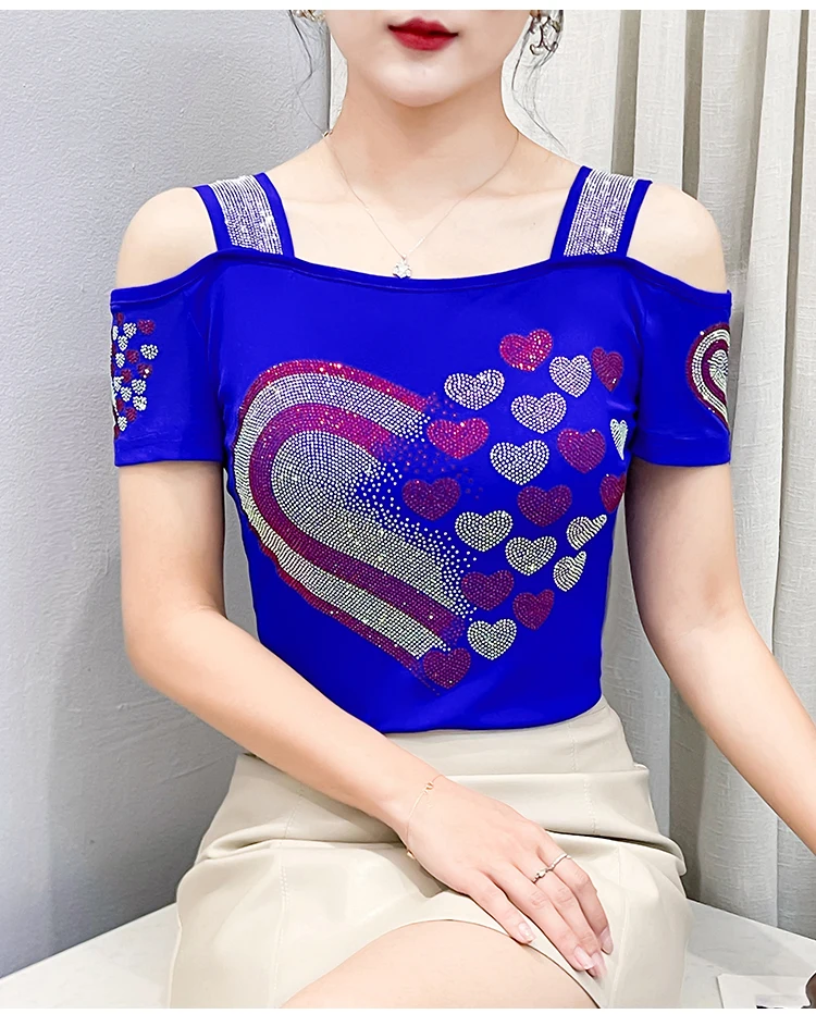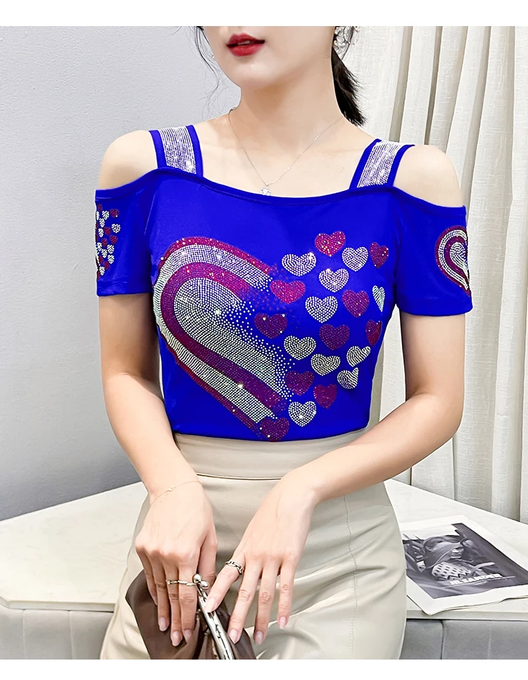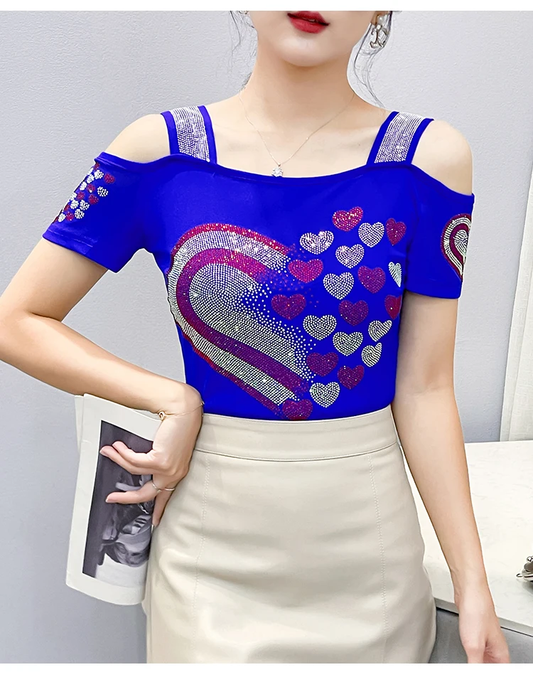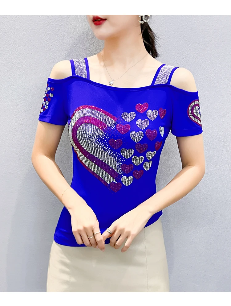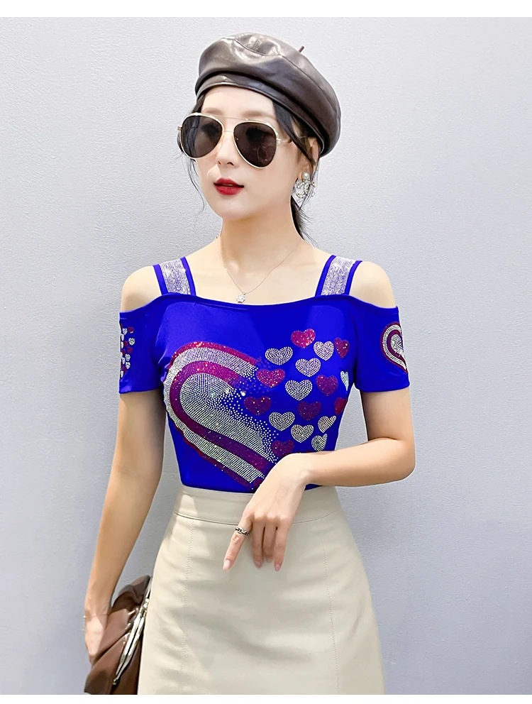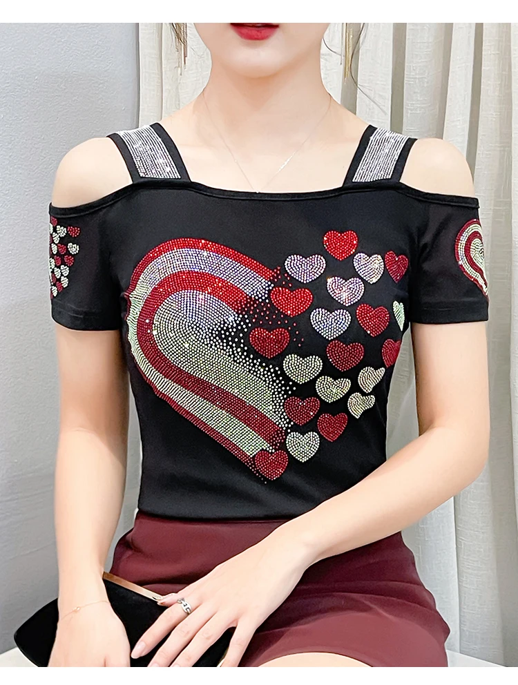 High Quality Women Short Sleeve Mesh Tees Clothes Luxury Love Heart Shiny Diamonds Summer T-Shirt Female Streetwear Fashion Tops