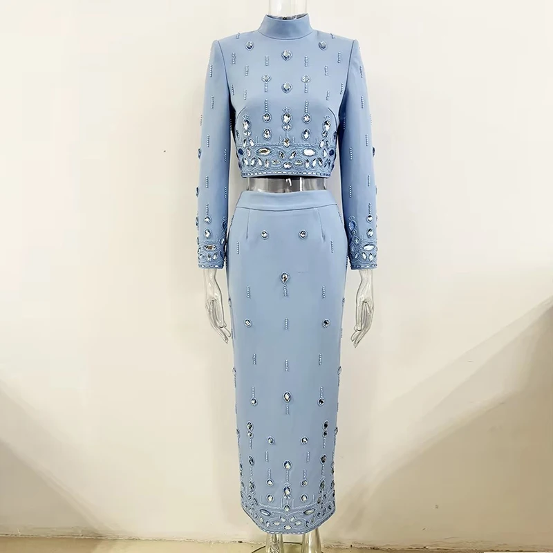 HIGH STREET Newest Fashion 2026 Designer Runway Suit Set Women’s Stand Collar Zip Back Cropped Tops Long Skirt Set 2pcs