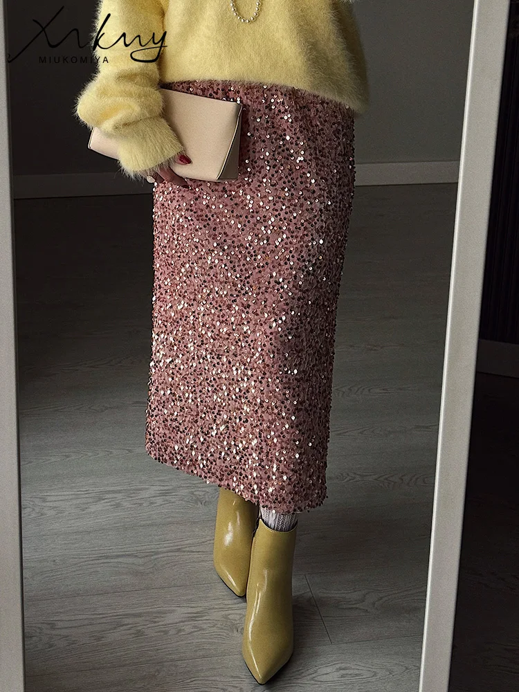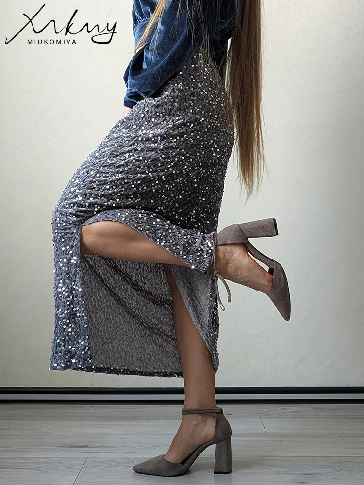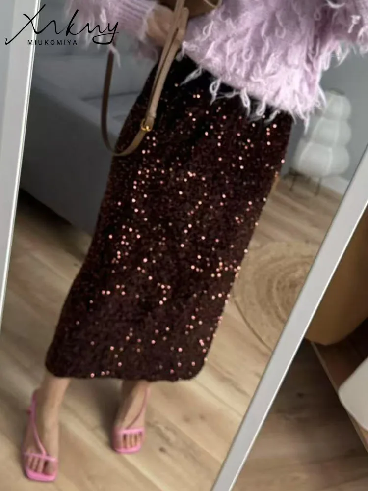 High Waisted Sequin Maxi Skirt Women Elegant Shiny Straight Skirts With Slit Summer Spring Black Long Sequin Skirt For Women