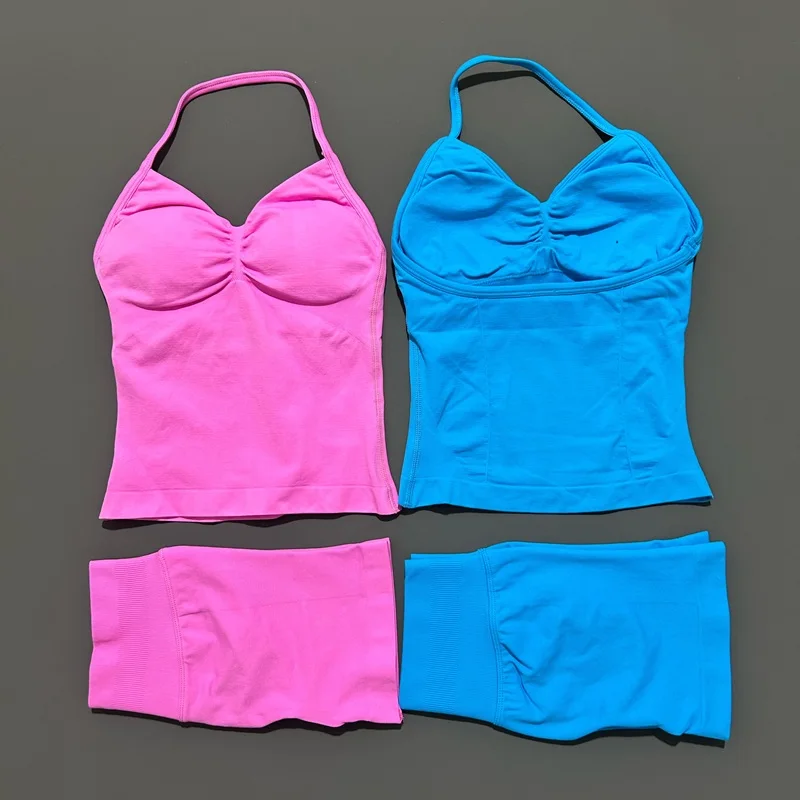HISTELLO 2 Pieces Sports Set Women Backless Tank Yoga Tops Scrunch Seamless Shorts Sport Gym Set Sportswear Workout Set