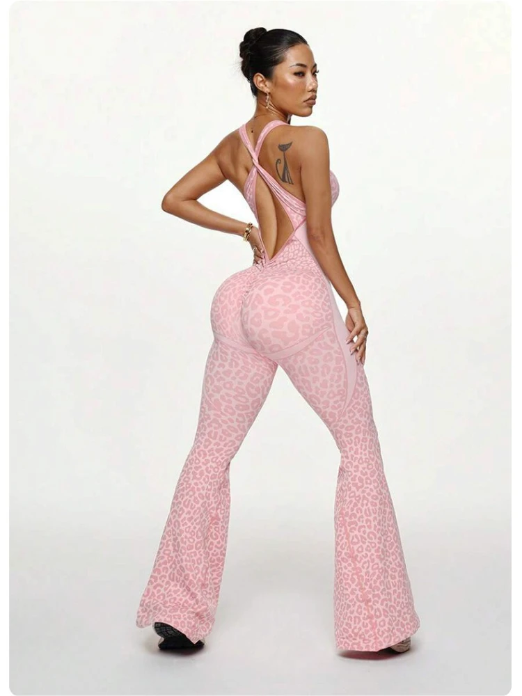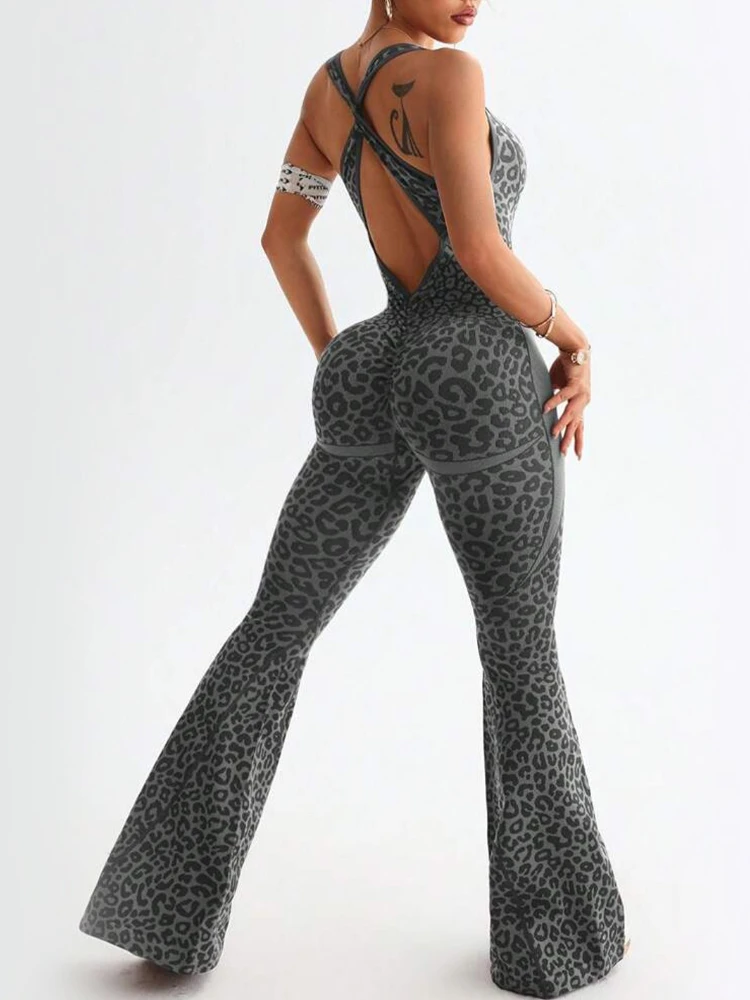 Hot Sexy Leopard Jumpsuits Sportwear Women Casual Sleeveless Backless Flare Pants Fitness Yoga Overalls Gym Running Tracksuit
