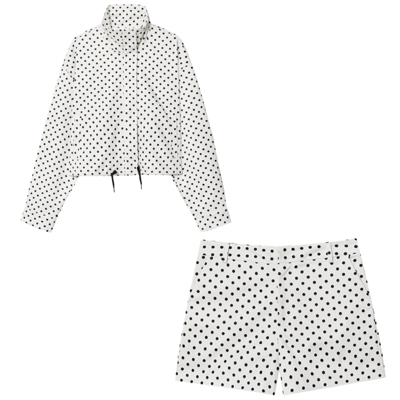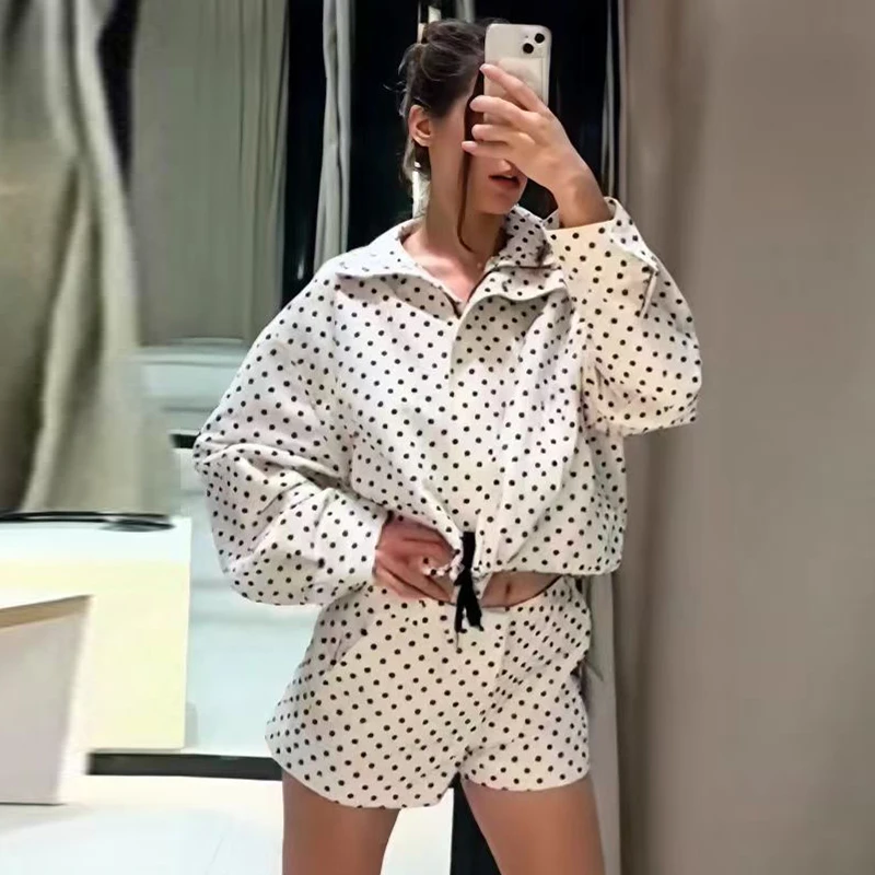 HXAO Polka Dot Short Sets Women’s Two Pieces Set Women’s Long Sleeve Top Jacket 2 Pieces Set For Woman High Waist Short Outfits
