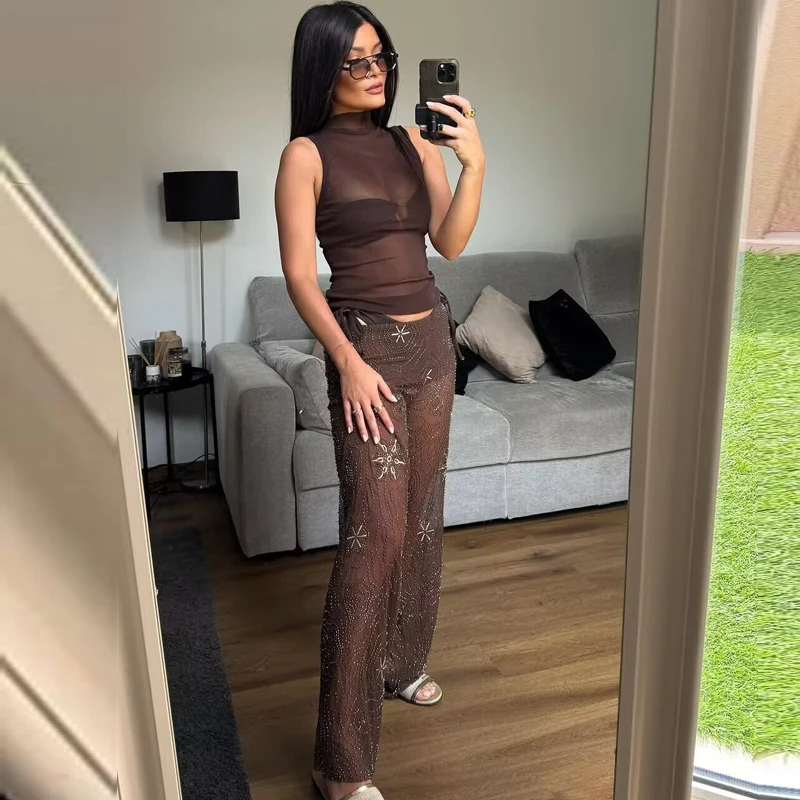 HXAO Tulle Women’s Two Pieces Set Baggy Sequin Pants Sets Strapless Crop Top Beaded Long Pants 2 Piece Sets Semi Sheer Trousers
