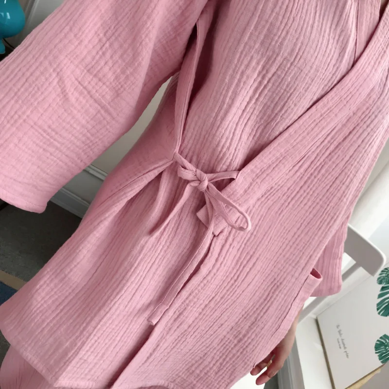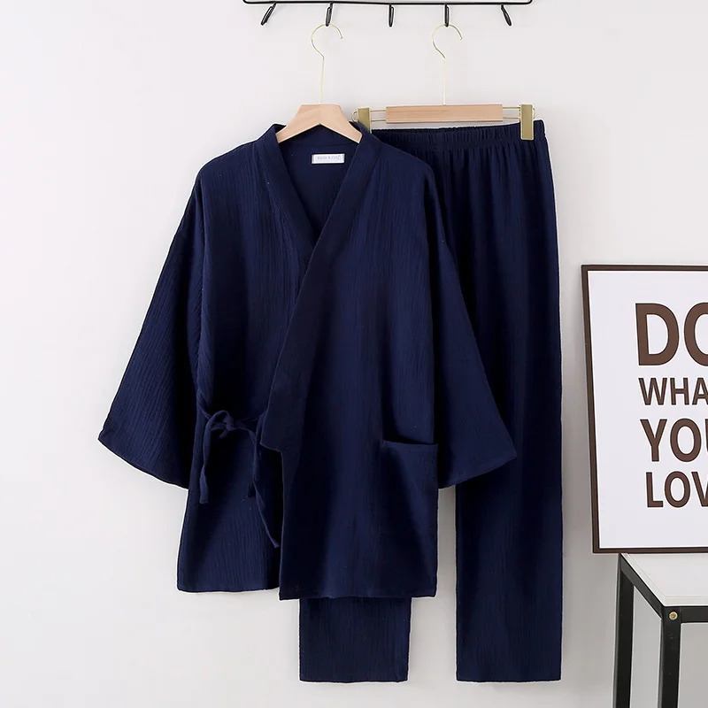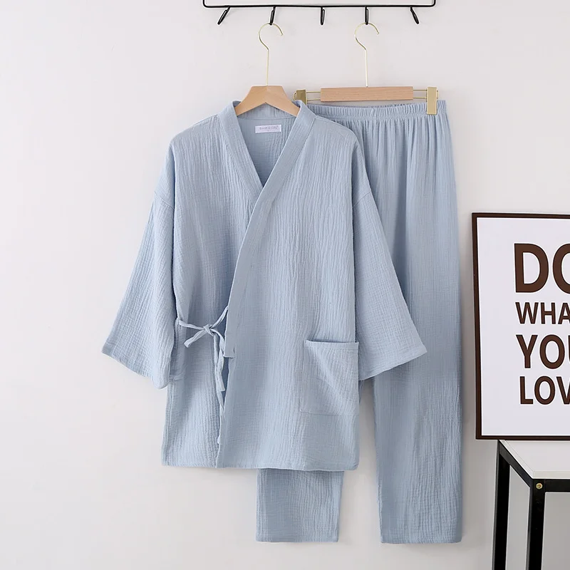 Japanese kimono suit lovers 100% cotton crepe pajamas long sleeved trousers two-piece kimono suit for men and women sleepwear