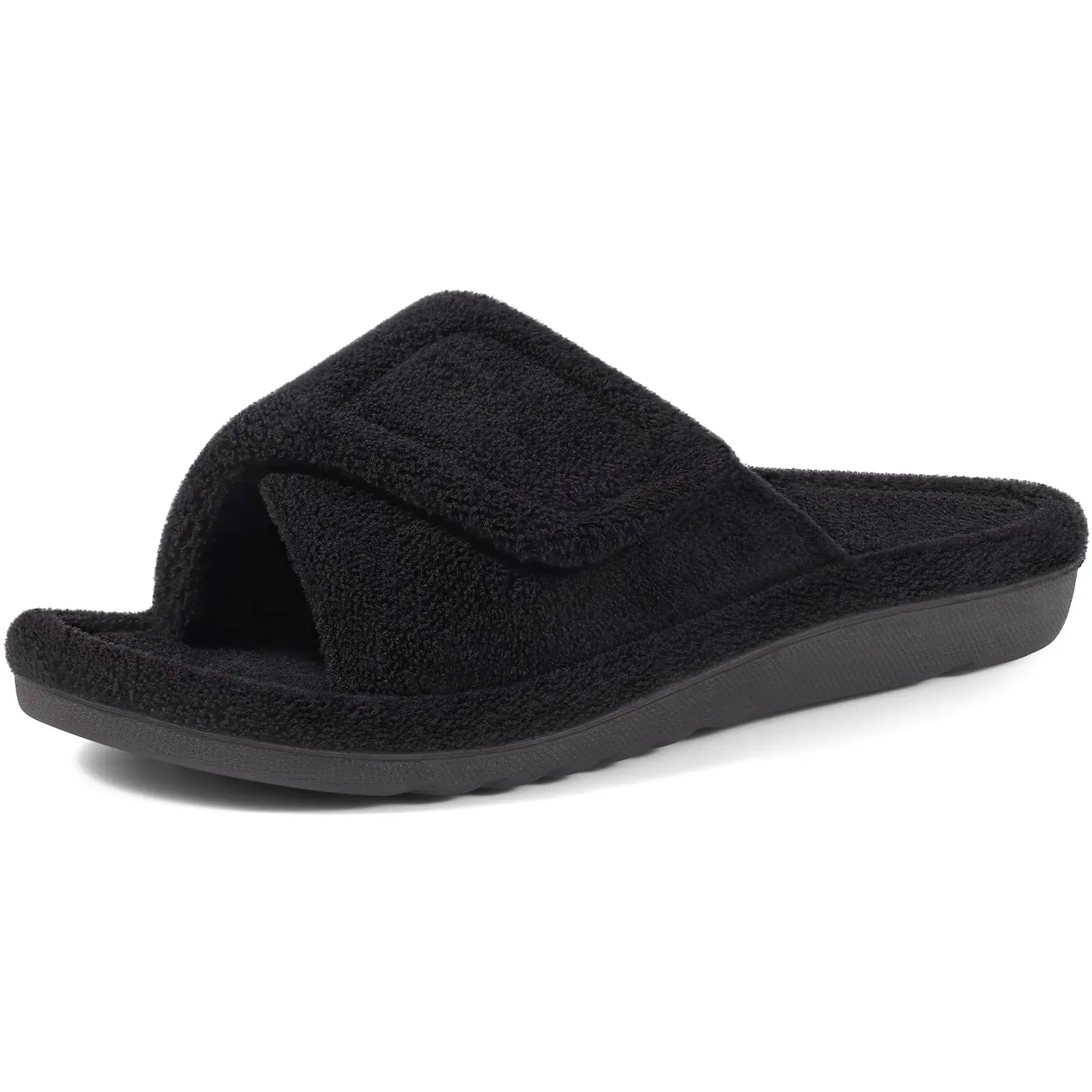 【Luxury Comfort】The terry cloth feels soft and plush, creating a luxurious and spa-like feel every time you slip them on; Adjustable velcro strap ensures a snug fit, increases stability and flexibility; Open-toed design with fuzzy material provides breathability, preventing your feet from feeling too warm in summer and too cold in winter
