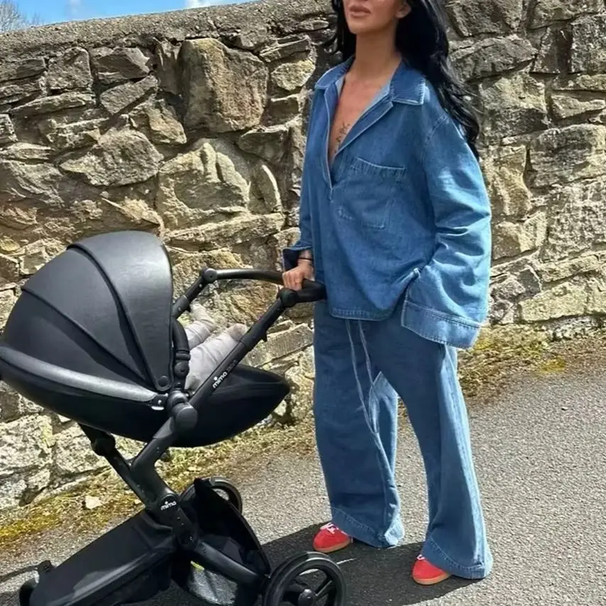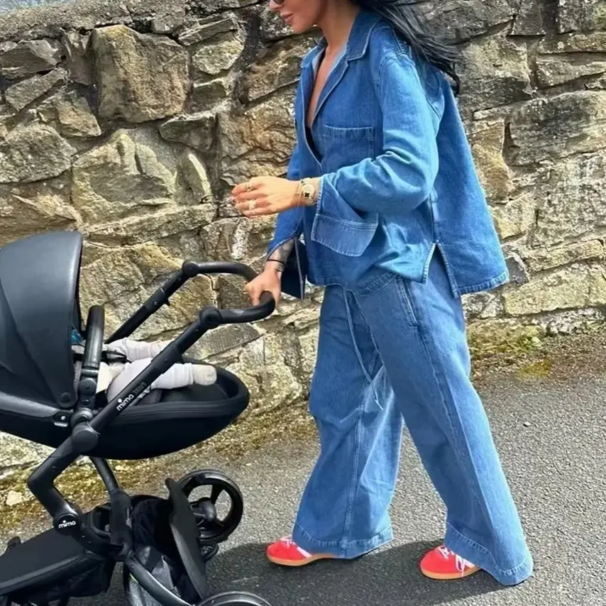 KONDALA 2025 Fall Winter Casual Denim Women Suits Fashion Vintage Turn-down Collar Pocket Shirts Chic Drawstring Wide Leg Pants