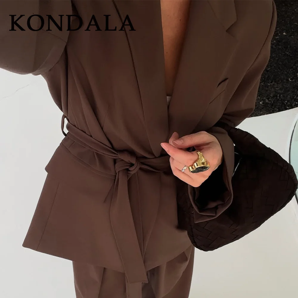 KONDALA 2026 Spring Office Lady Elegant Brown Women Suit Fashion Casual Sashes Oversized Shrug Blazer Chic Zipper Long Pant