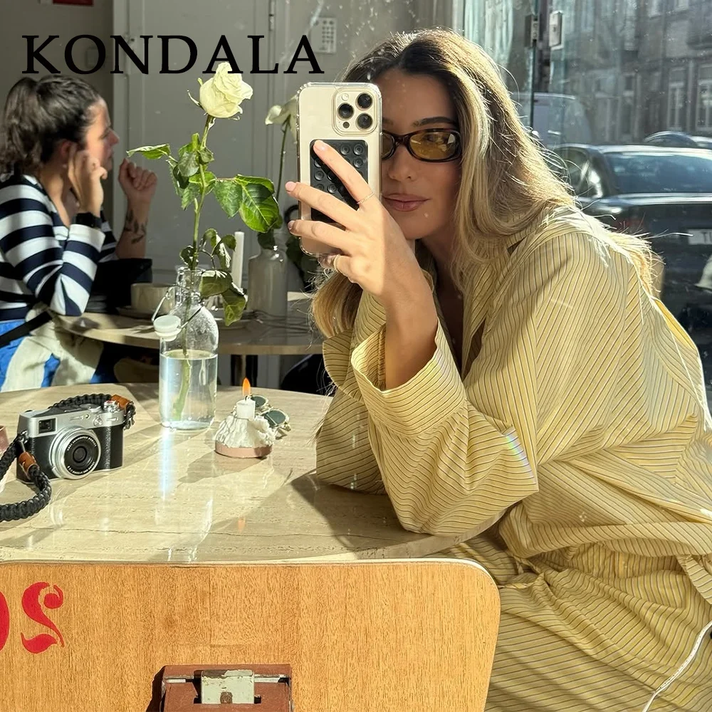 KONDALA 2026 Spring Summer Casual Butter Yellow Striped Women Suit Fashion Vintage Turn Down Collar Loose Shirt Drawstring Pant