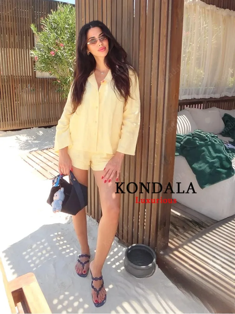 KONDALA Casual Chic Women Yellow Suit V-Neck Full Sleeve Single Breasted Blouse Elastic Shorts Fashion 2025 Spring Summer Set