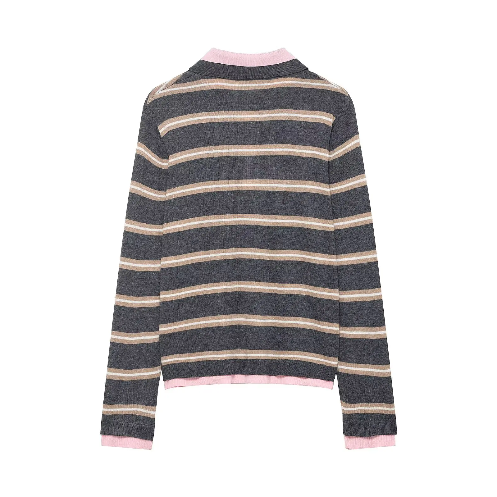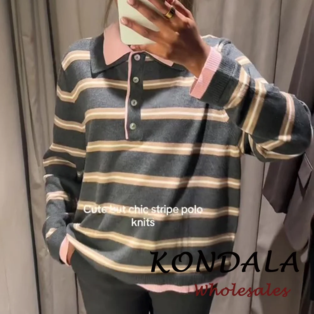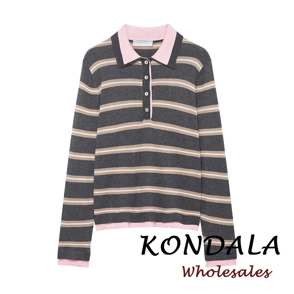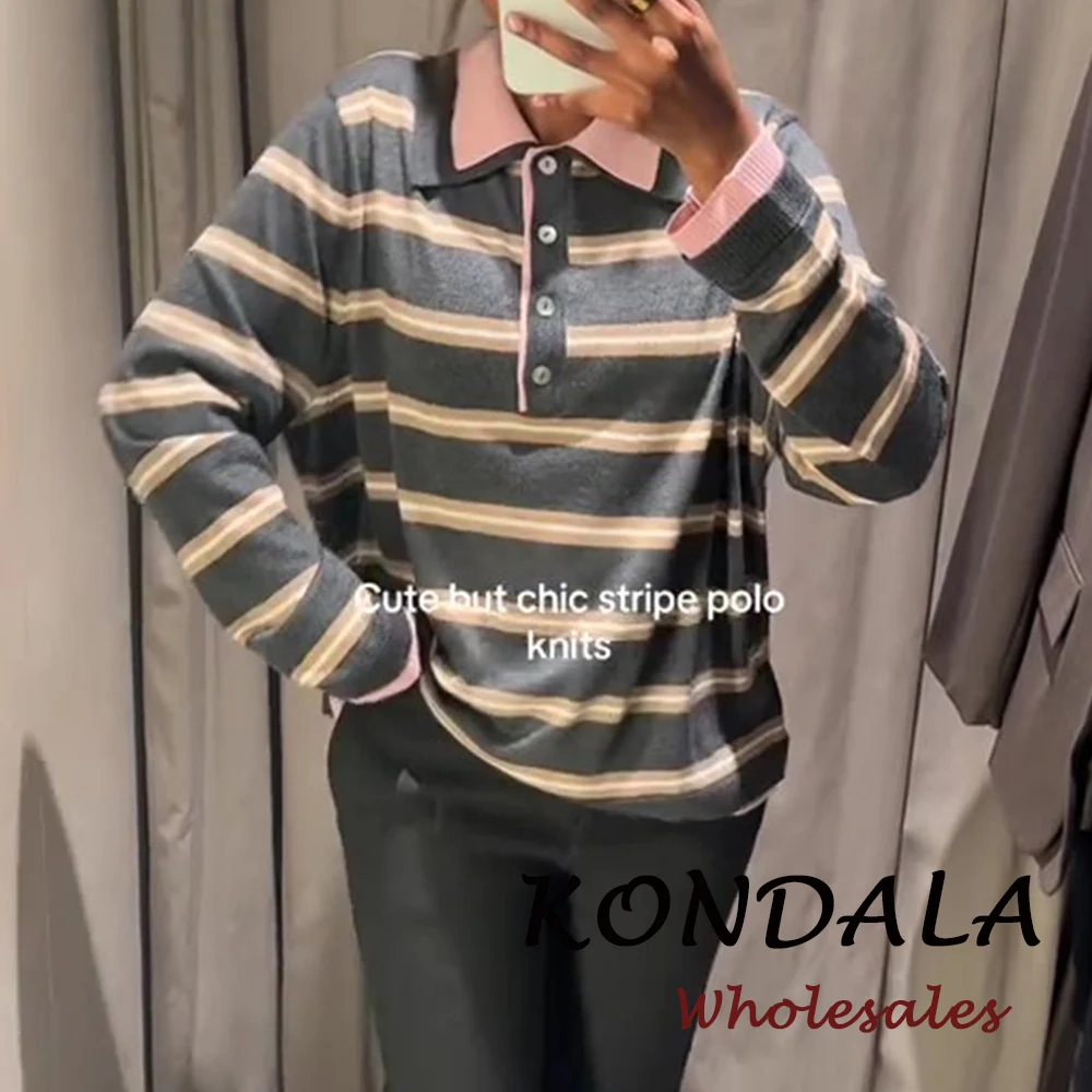 KONDALA Fashion Vintage 2026 Spring Striped Polo Women Knit Shirt Casual Loose Buttons Long Sleeve Streetwear Female Chic Tops