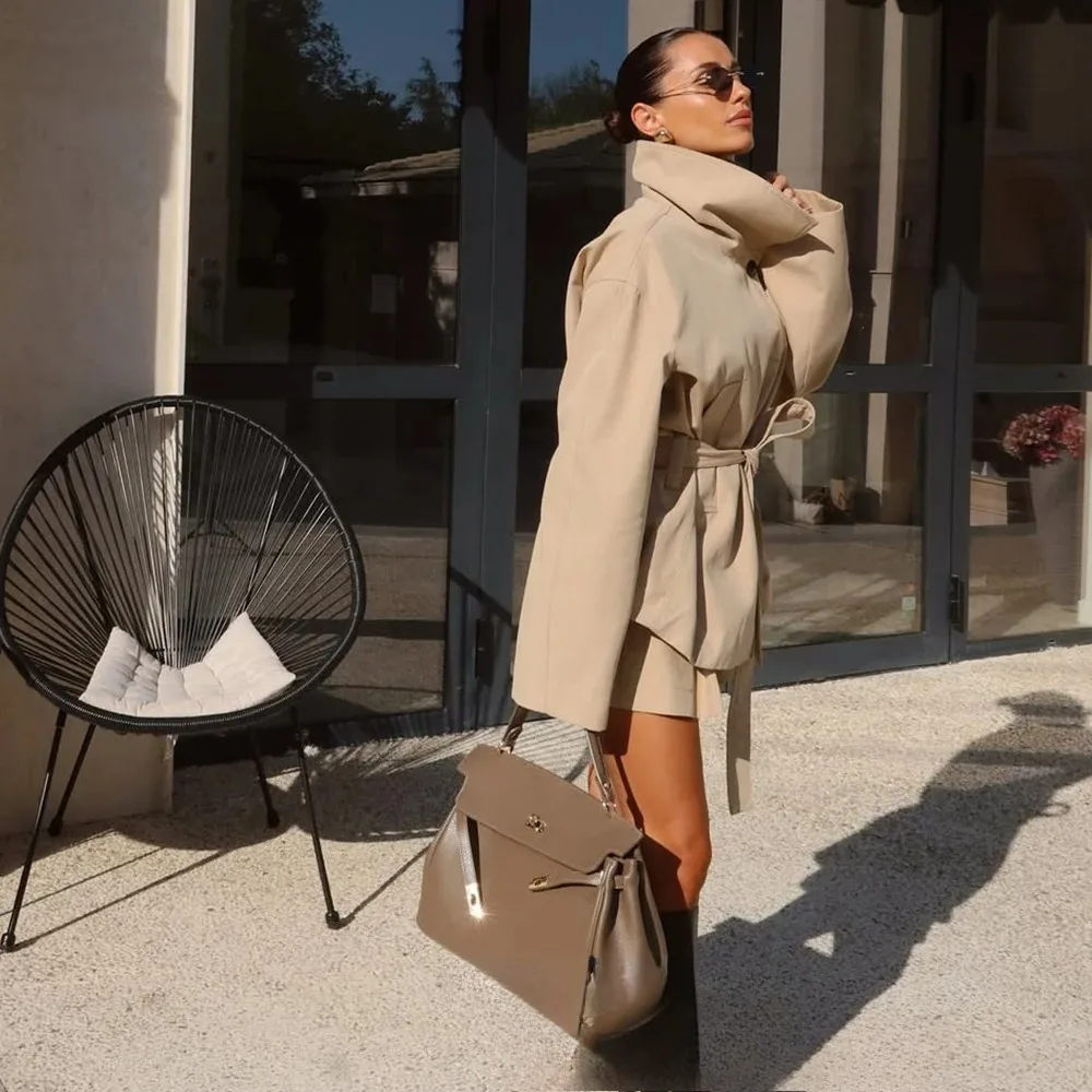 KONDALA Office Lady Khaki Suits Women Long Sleeve Sashes Button Trench Jakcets Wide Leg Button Shorts Fashion 2025 Autumn Suits