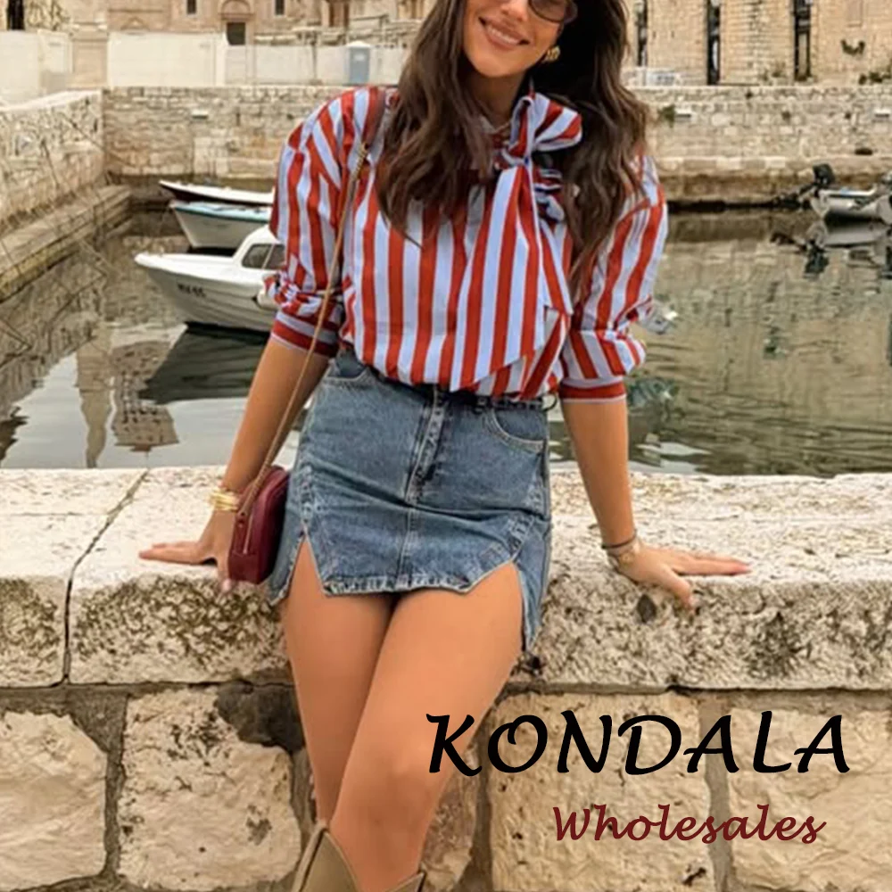 KONDALA Vintage Striped Bow Women Casual Asymmetric Shirt Fashion 2026 Spring Single Breasted Shirt Streetwear Chic Female Shirt