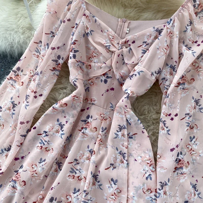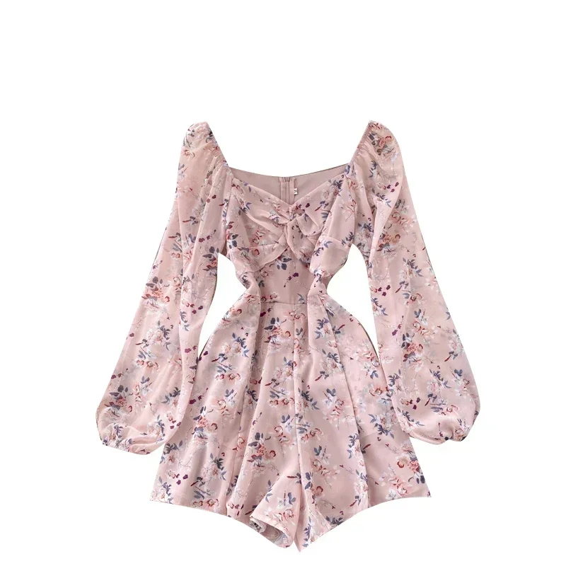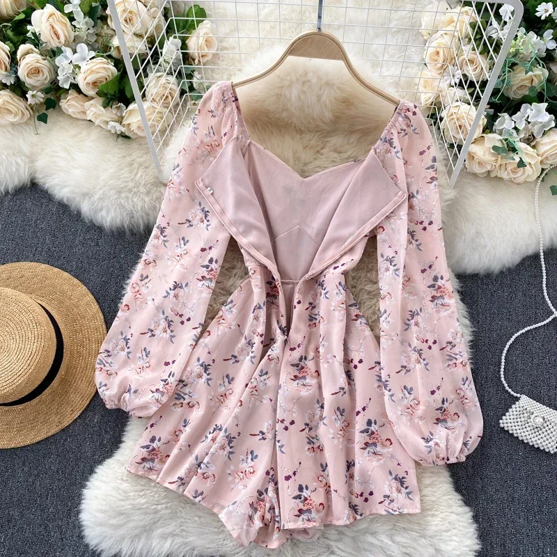 Korean New Spring Summer Chiffon Jumpsuit V-neck Puff Sleeves Folds Slim Slimming Floral Wide-leg Shorts Jumpsuit UK770