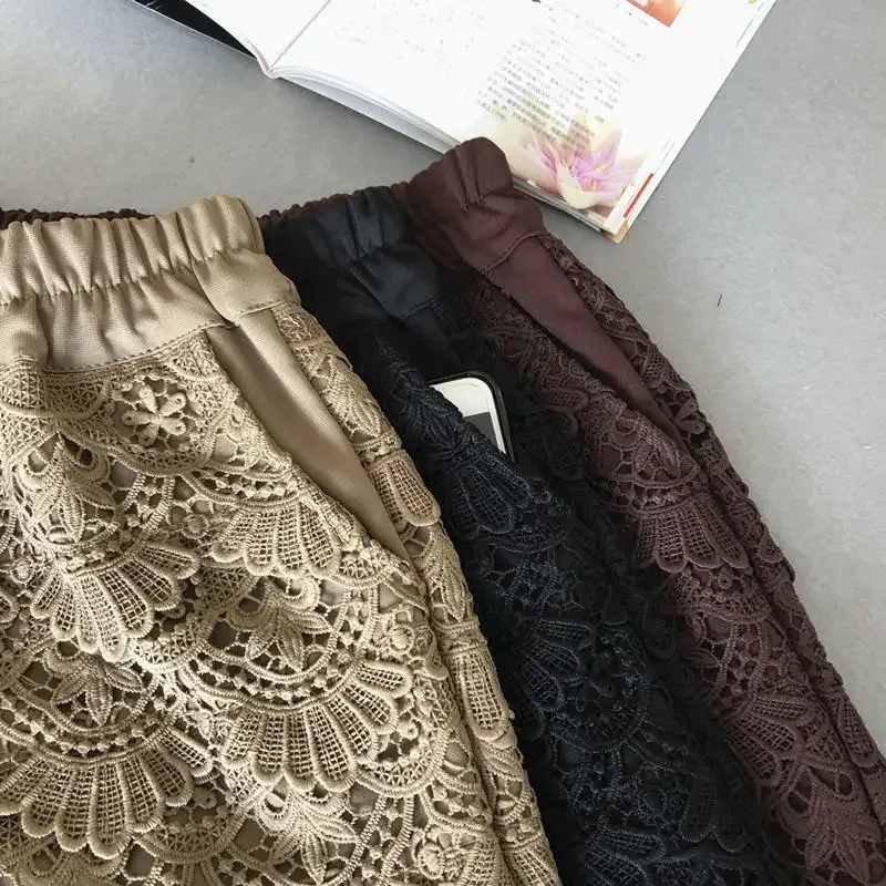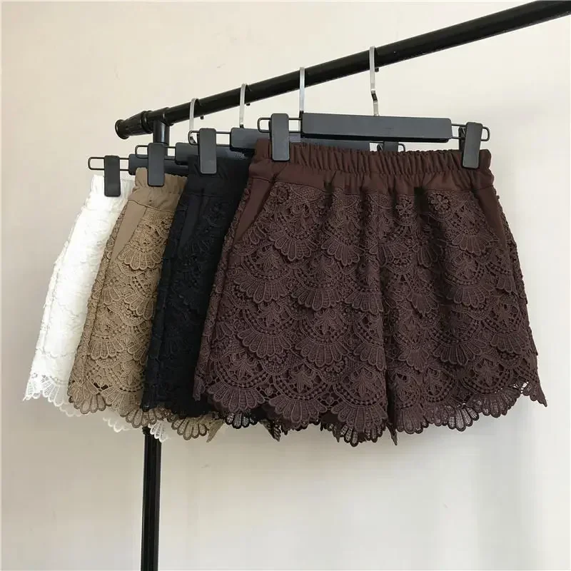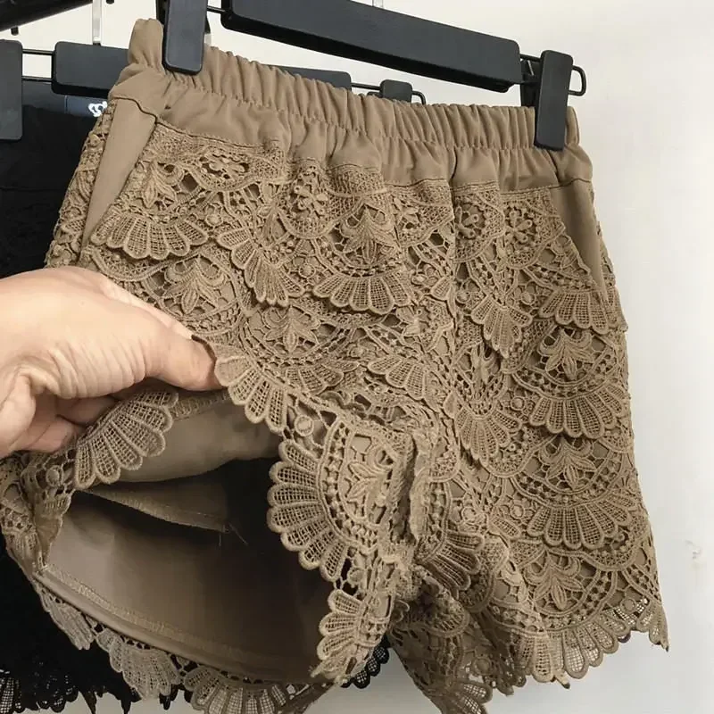 Spring Summer Shorts Women Casual High Waist Lace Hollow Out Shorts Streetwear Elastic Loose Sexy Shorts Feminino Solid