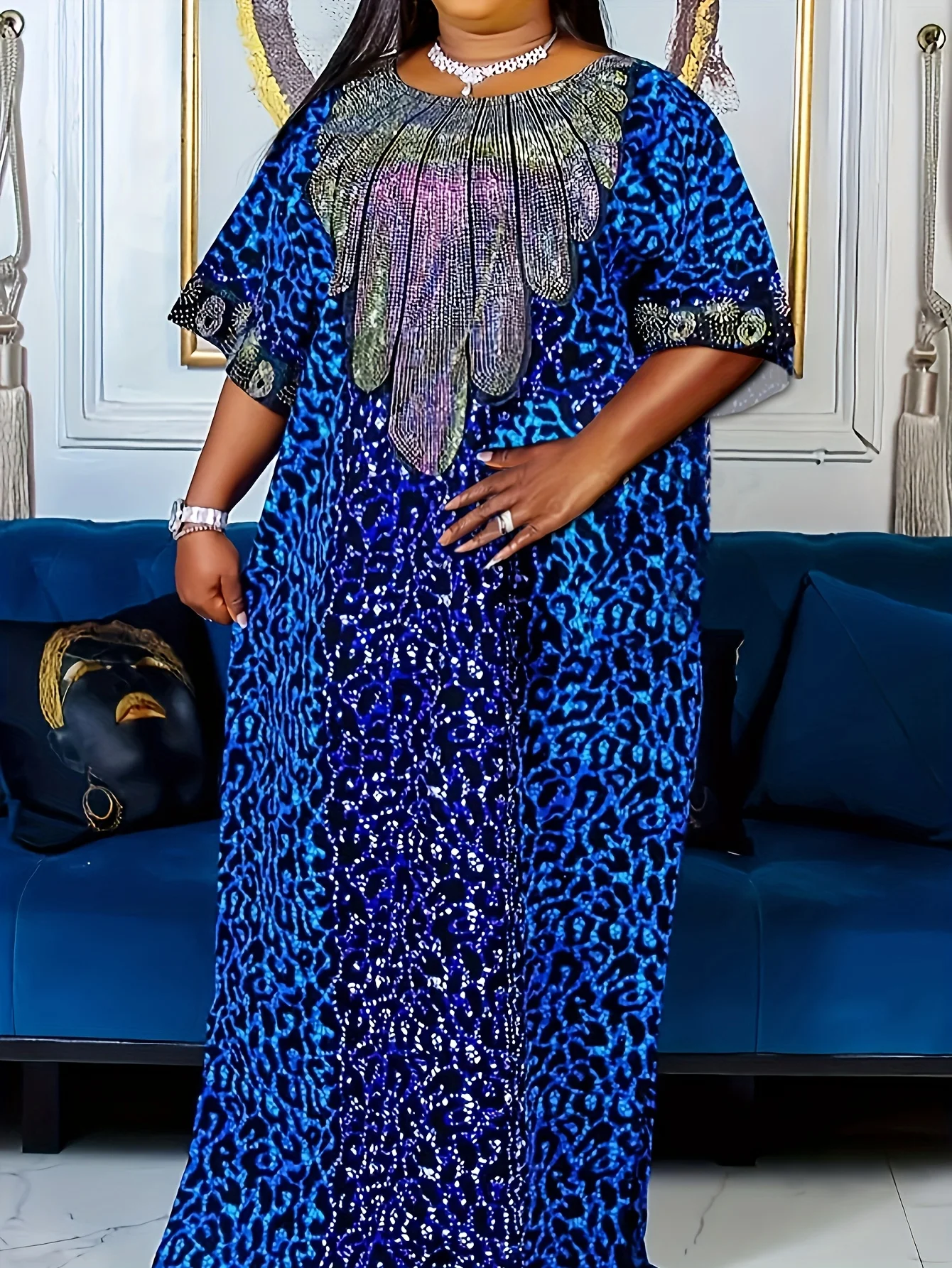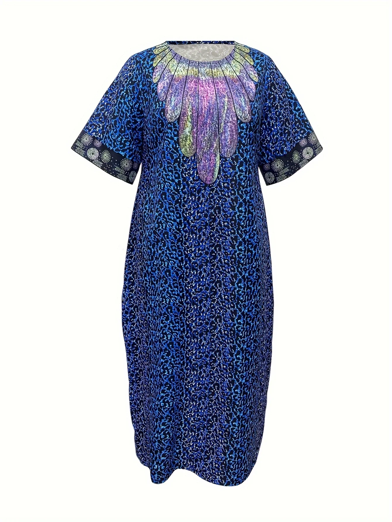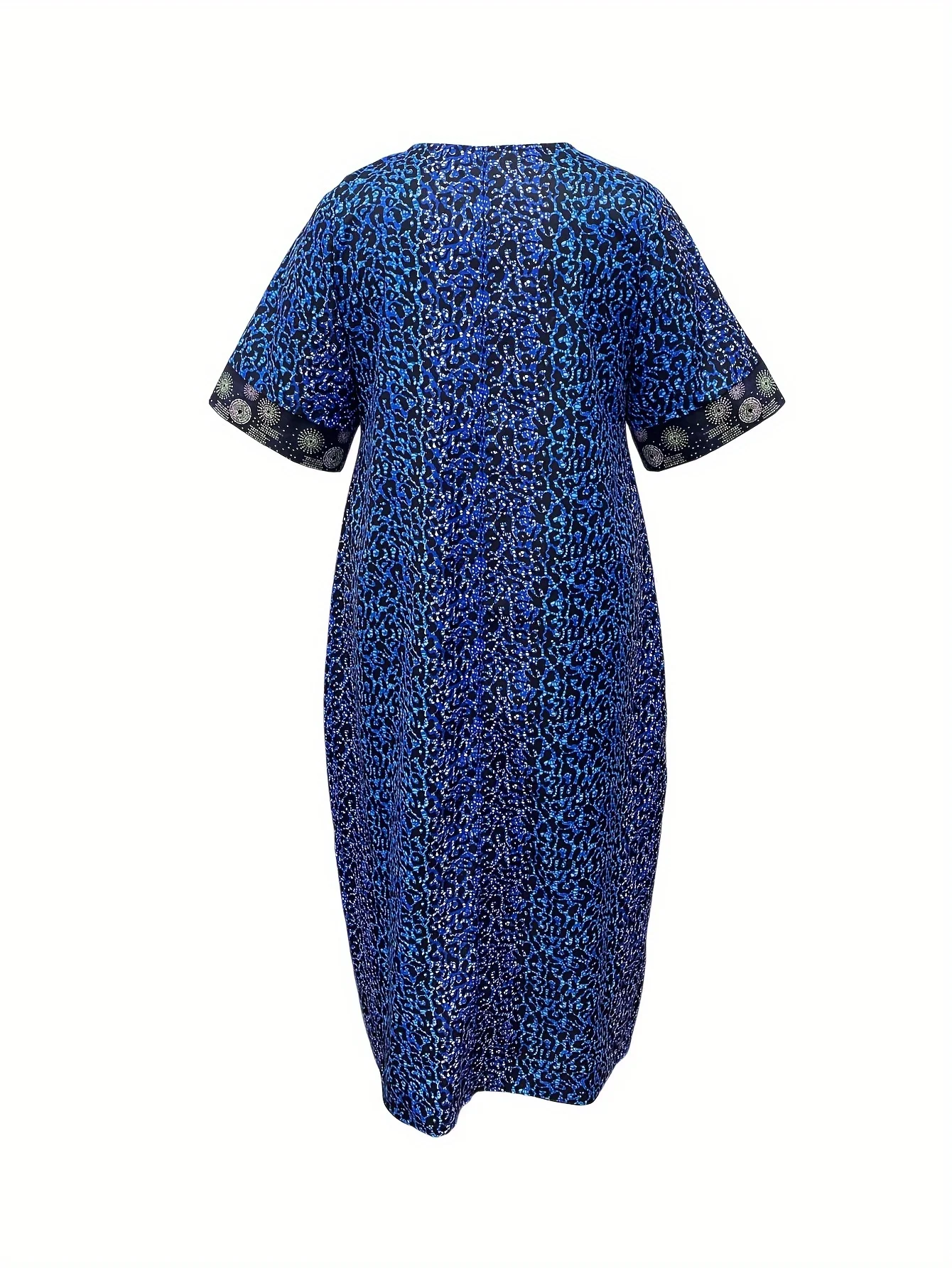 Leopard Print Round Neck Decoration Half Sleeved Straight Tube Loose Shiny Long Skirt