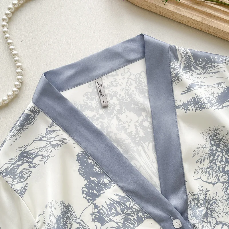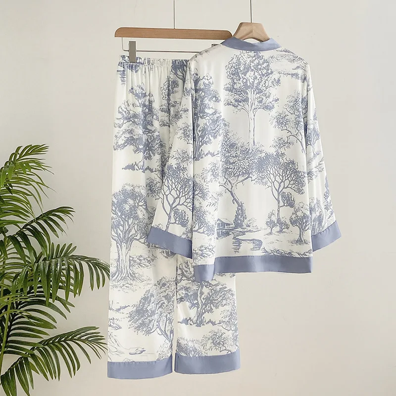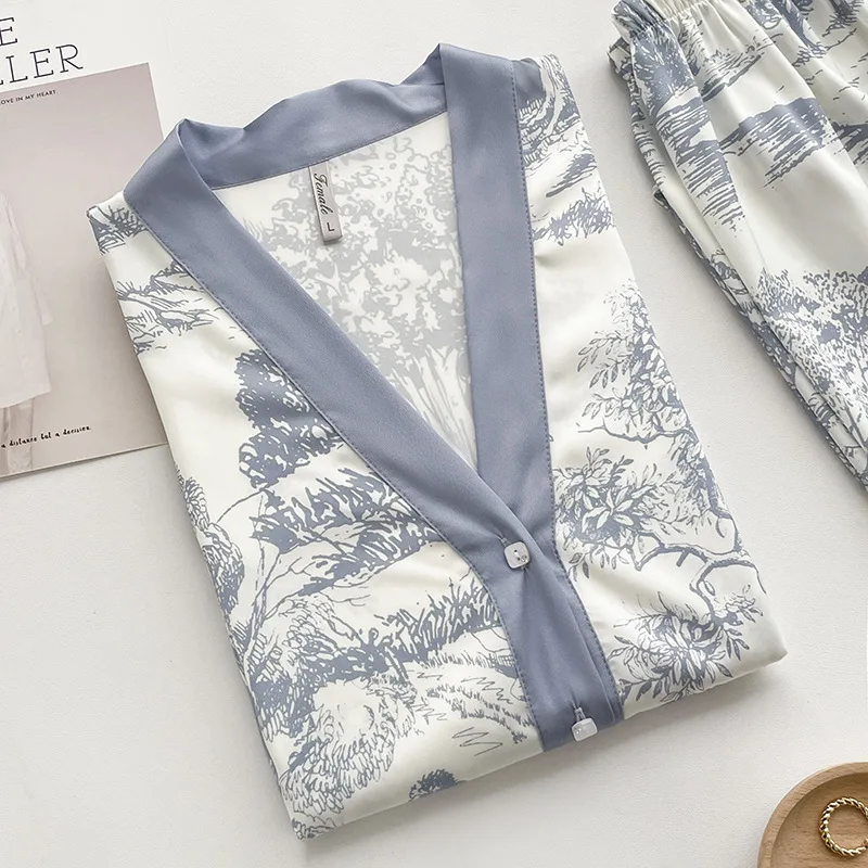 Lisacmvpnel Ice Silk Print Fashion Women Pajama Set Long Sleeve Suit Pajamas