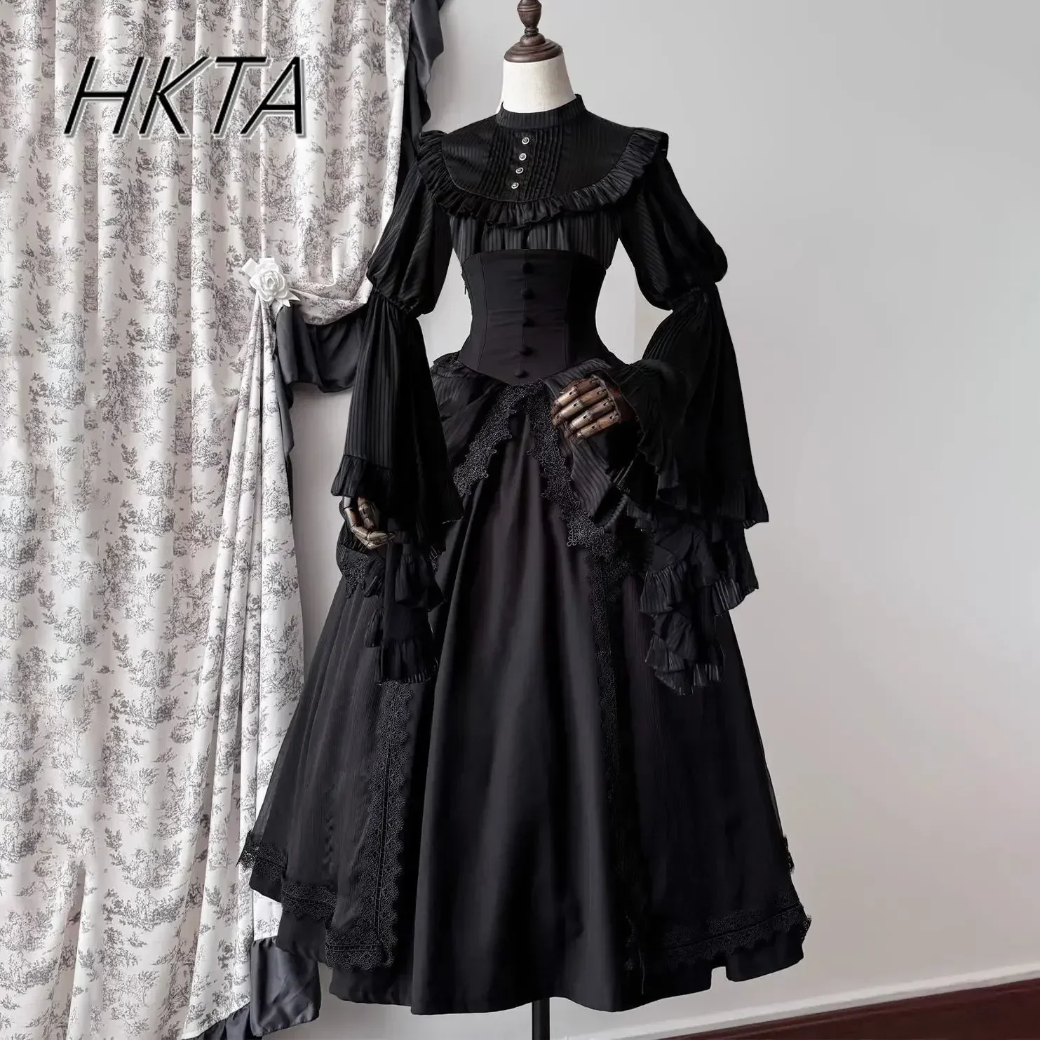 Lolita Shirts Pure White Black Ji Sleeves Shirt SK Fishbone High Waist Skirt Women Dark Goth Slim Blouse Long Skirt 2-piece Set