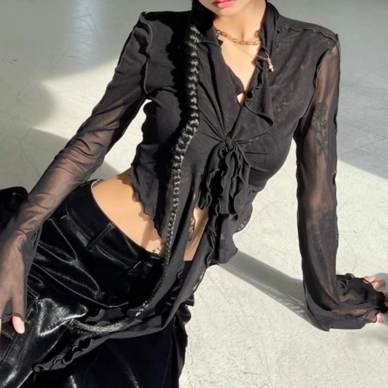Long Flare Sleeve Blouses for Women Lace-up Mesh Sexy Sweet Hot Girls Korean Fashion Style All-match Solid Design Elegant Casual