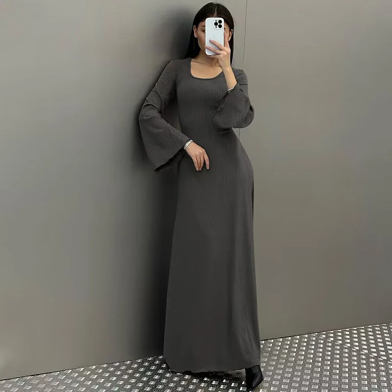 Long Flare Sleeved Maxi Floor-Length Dress Summer Solid Fashion Casual Office Lady Dresses for Women Slim Sexy Lace-up Vestidos