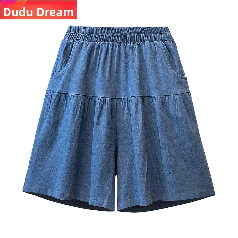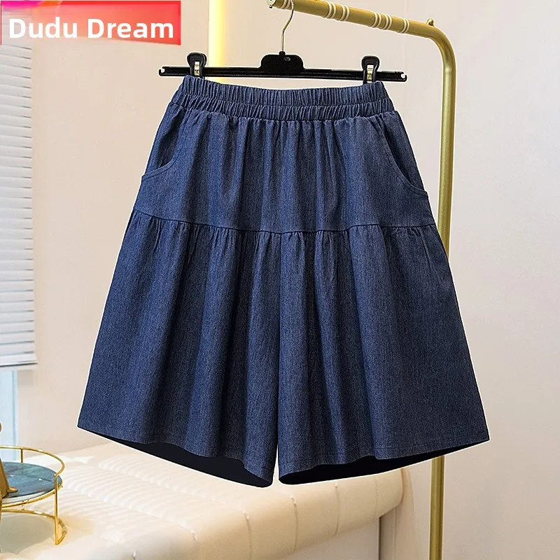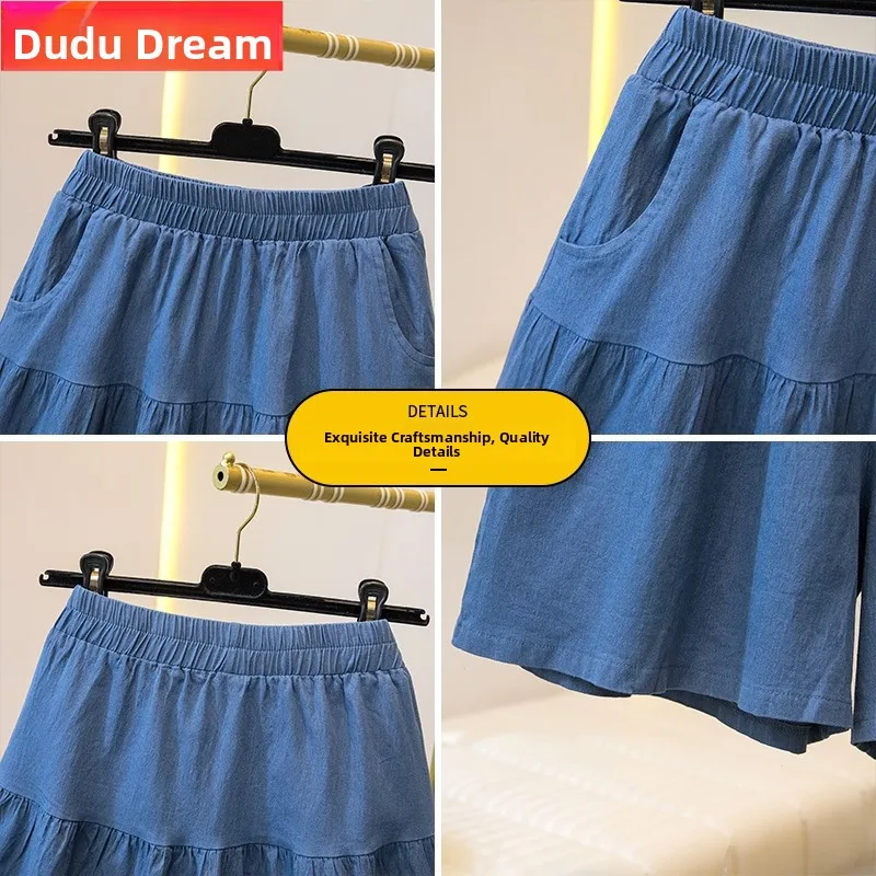 Loose A-Line Denim orts Women’s Summer Thin Ice Silk Wide Leg Five-Quarter Length Middle Waist Pants plus Size