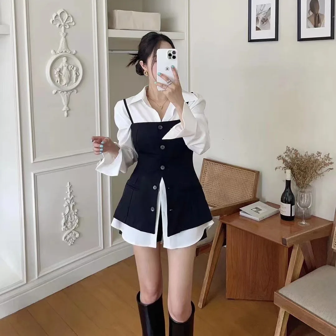Loose Long Sve irt Single Button Collar Vest Autumn Faion Women’s Two-Piece Set Ele Busin Casual Sle