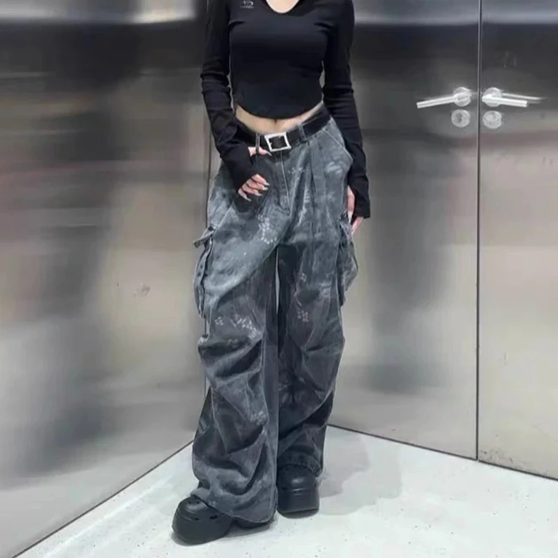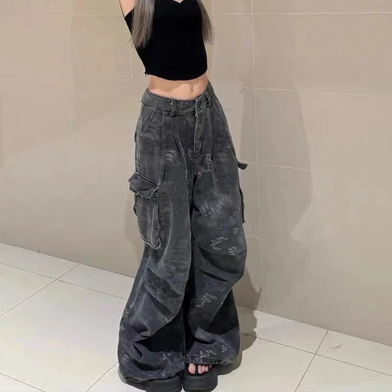 Loose Pocket Jeans Womens Cargo Workwear Camouflage American Style 2025 Autumn Winter High Waist Straight Leg Casual Pants