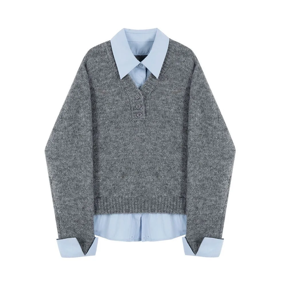 Loose Women’s Knitted Sweater with irt Collar Fake Two-Piece Autumn Winter Faionable Korean Sle Long Sve Ne