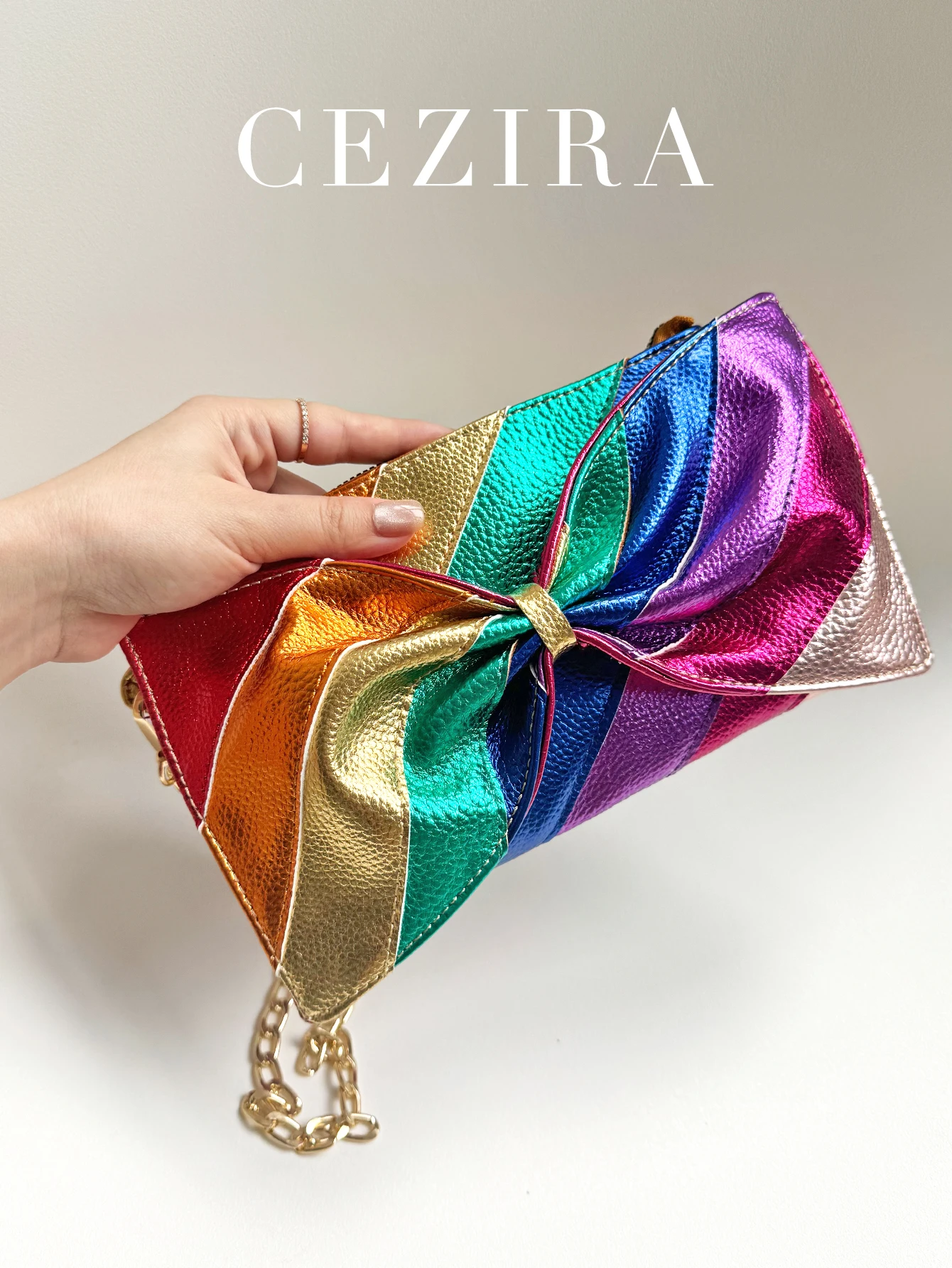 Luxury Metallic Vegan Leather Handbag Colorful Stripes Patchwork Sweet PU Bow knot Clutch Metal Chain Crossbody Bag Funky Y2K