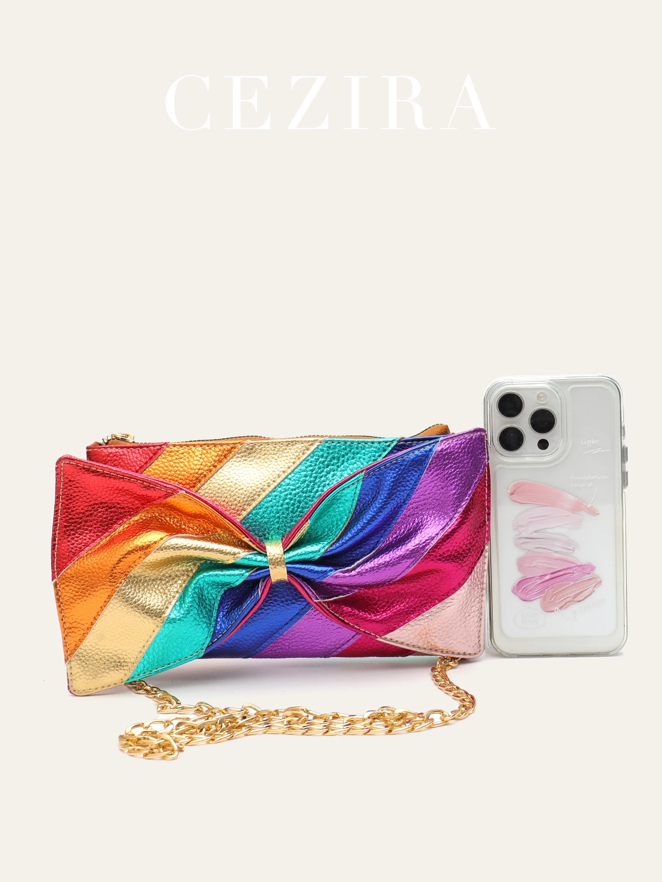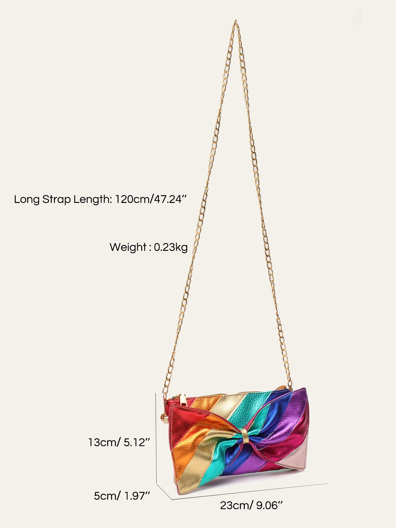 6 reviews for Luxury Metallic Vegan Leather Handbag Colorful Stripes Patchwork Sweet PU Bow knot Clutch Metal Chain Crossbody Bag Funky Y2K