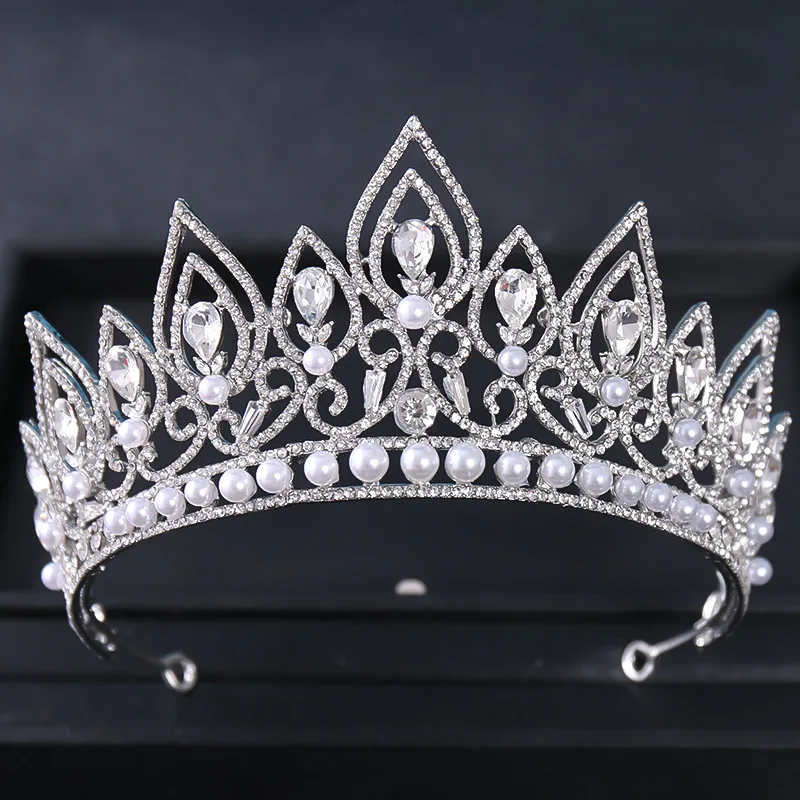Luxury Silver Color Crystal Pearls Bridal Tiaras Crown Baroque Rhinestone Pageant Diadem Bride Headband Wedding Hair Accessories