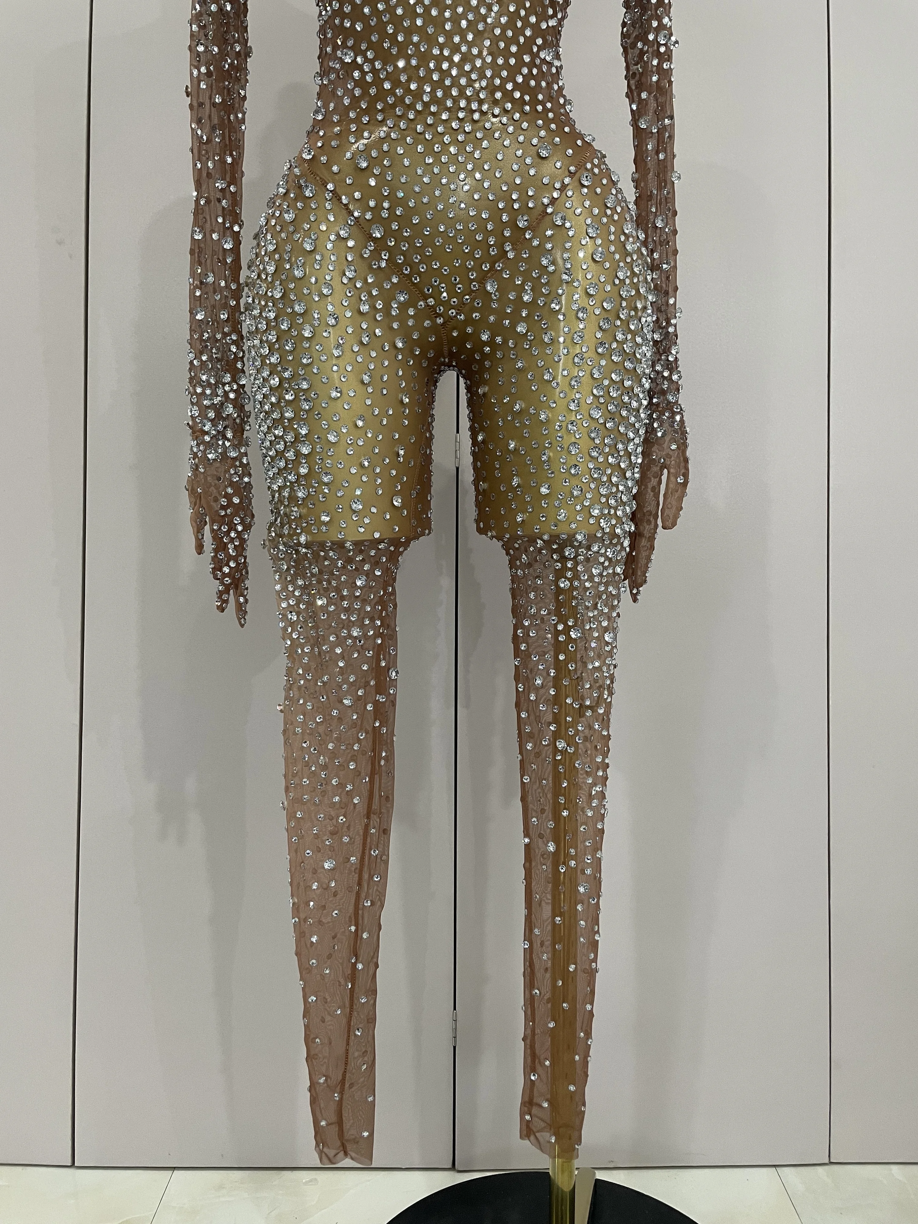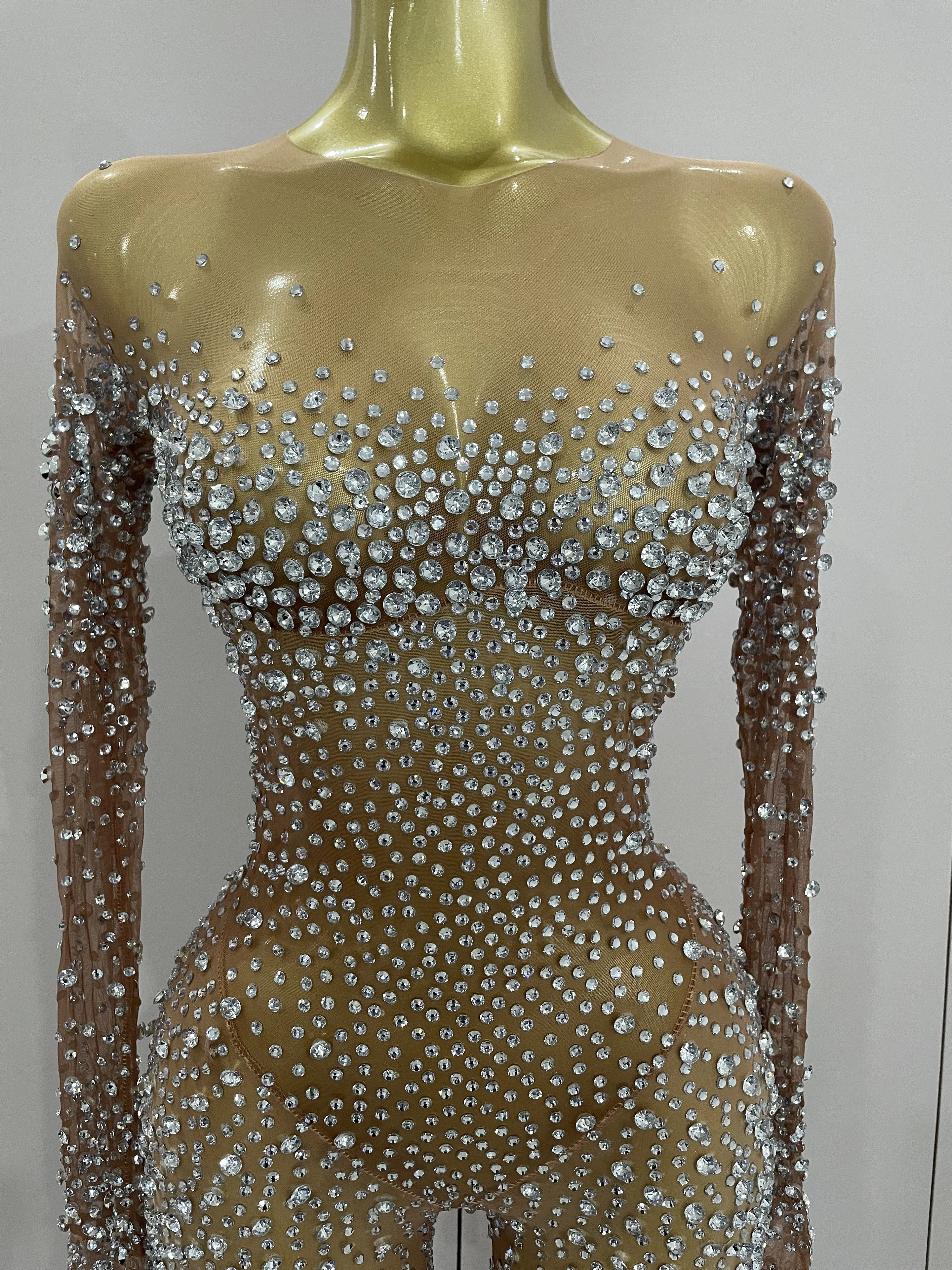 Luxury Sparkly Rhinestones Sexy Mesh See Through Bodycon Jumpsuit Women Birthday Gown Women Bar Nightclub Dancer Stage Outfit
