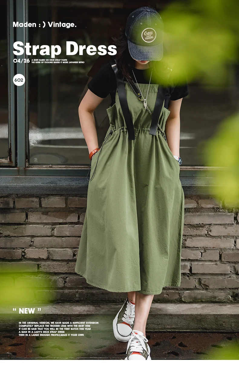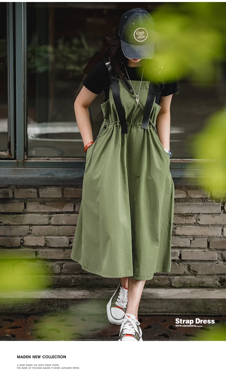 Maden Green Adjustable Strap Dress for Women Suspender Long Skirt Casual Loose Fit Cargo Sleeveless Dress for Summer