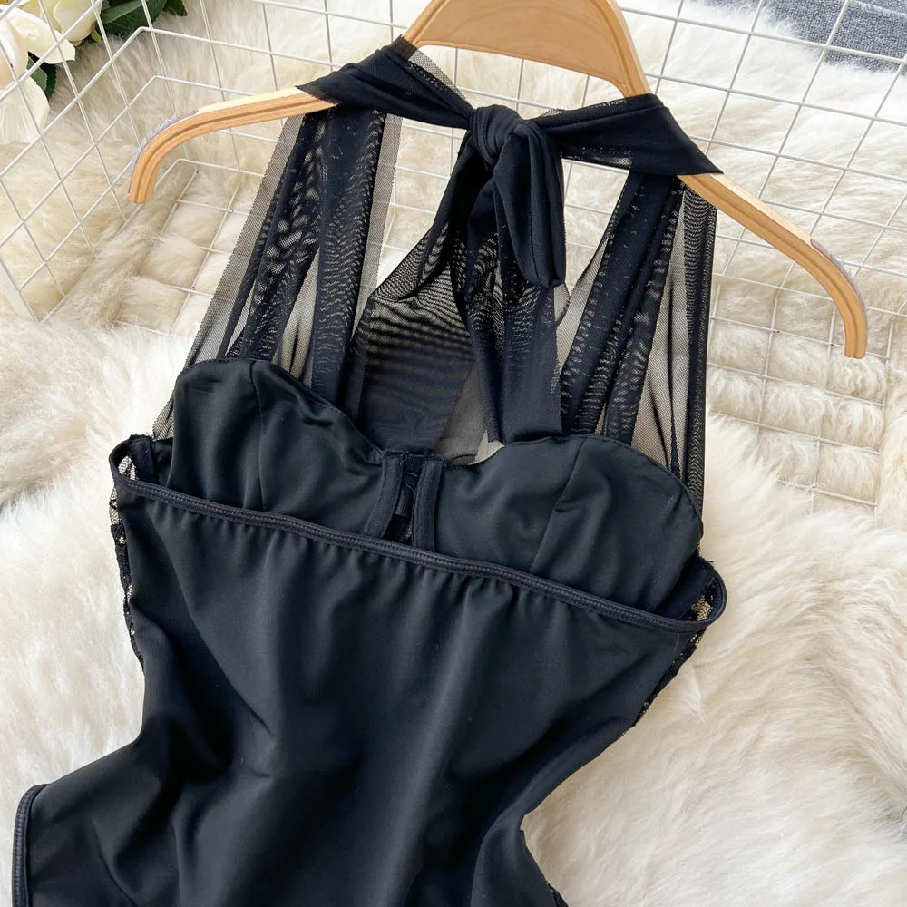 Magdalyn Women Sexy One Piece Mesh Rompers Tulle Skinny Fashion Streetwear INS Slim Catsuits Hollow Floral Combination Bodysuits