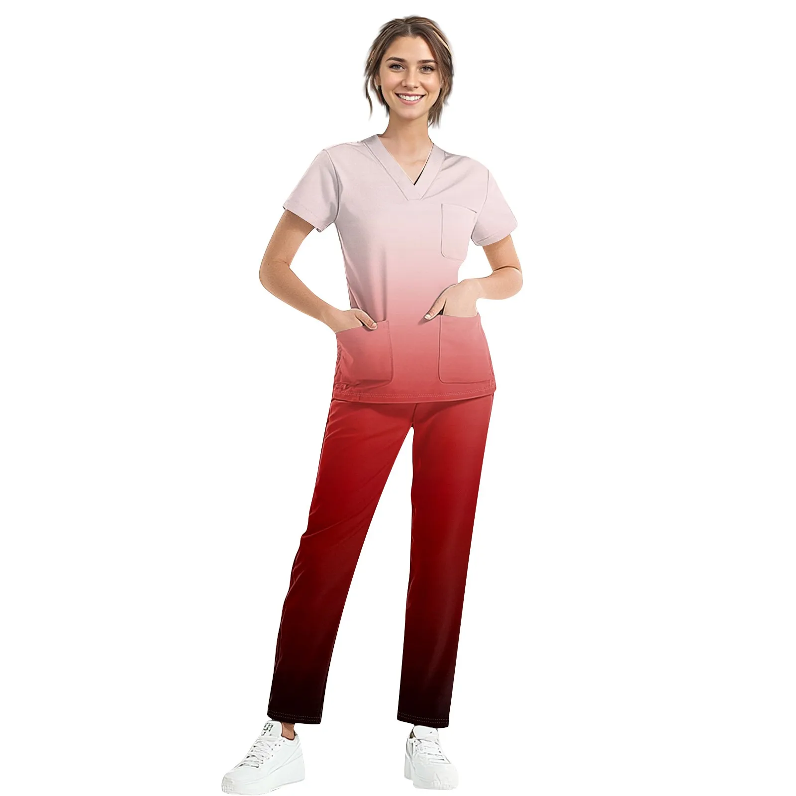 Women’s Short Sleeve V Neck Gradation Chest Pocket Work Top Elastic Waist Pants Two Piece Work Set,3 Pockets,Scrubs Tops For Women