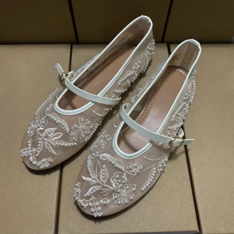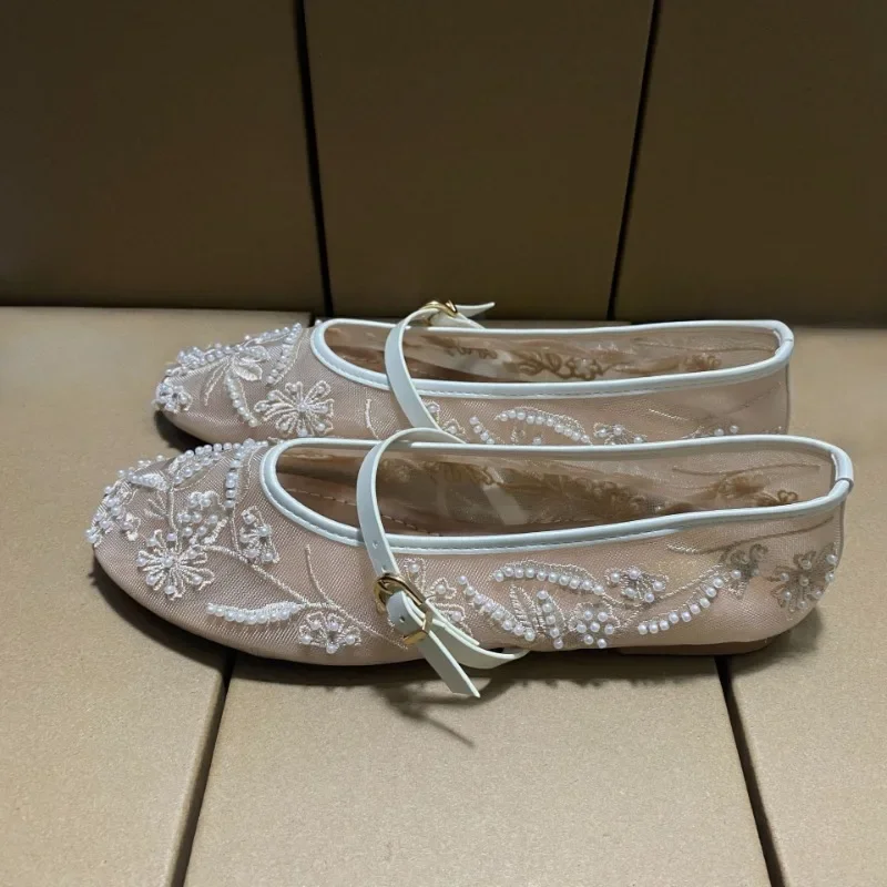 Mesh Embroidery Flower Ballet Flats Women Comfort Round Toe Breathable Mary Jane Shoes Fashion Brand Designer Shoes for Ladies