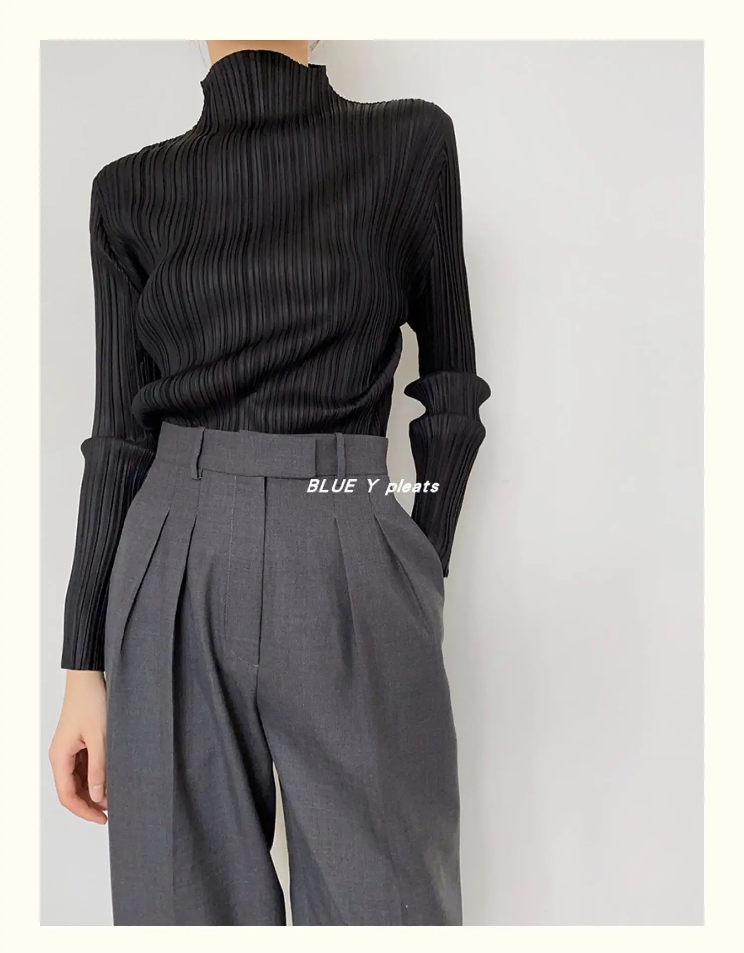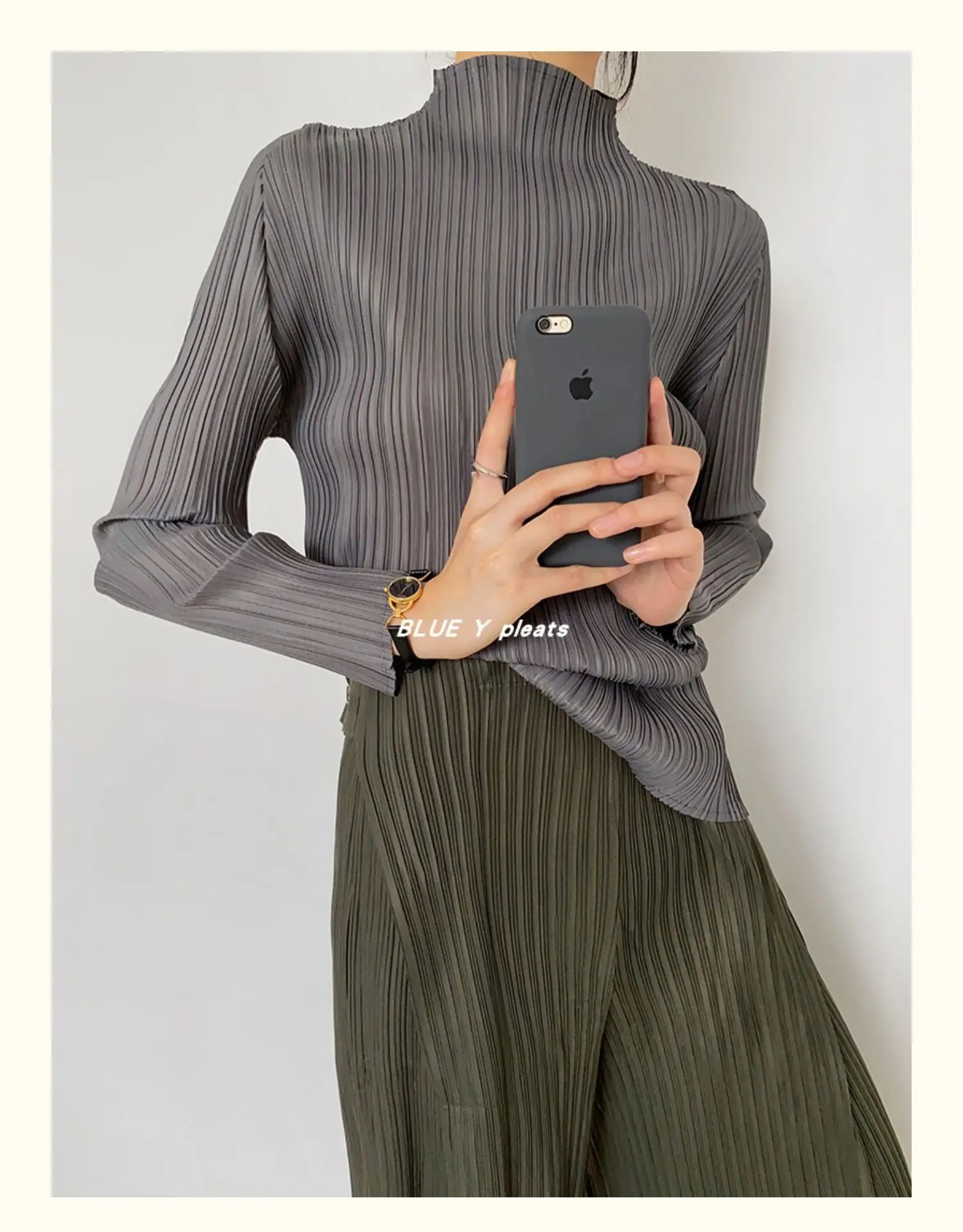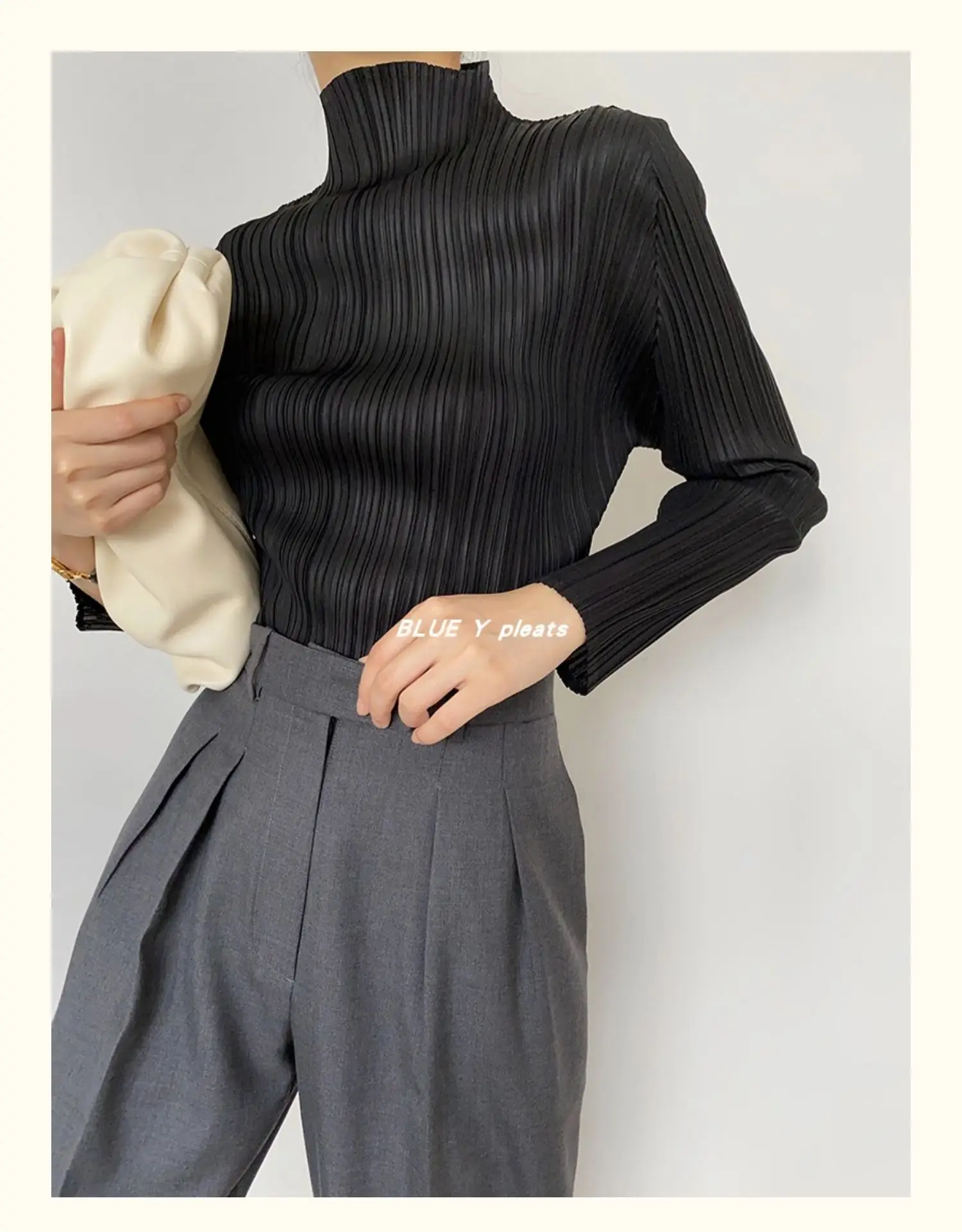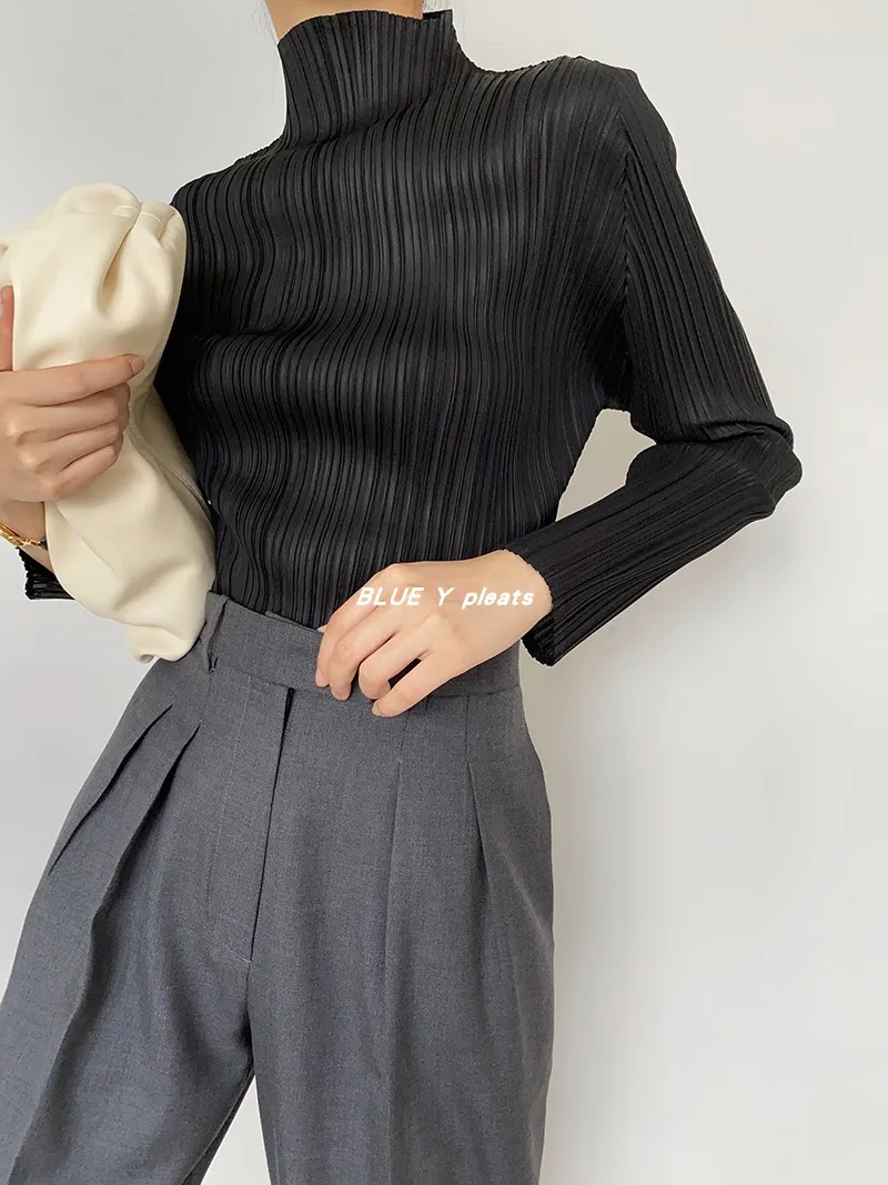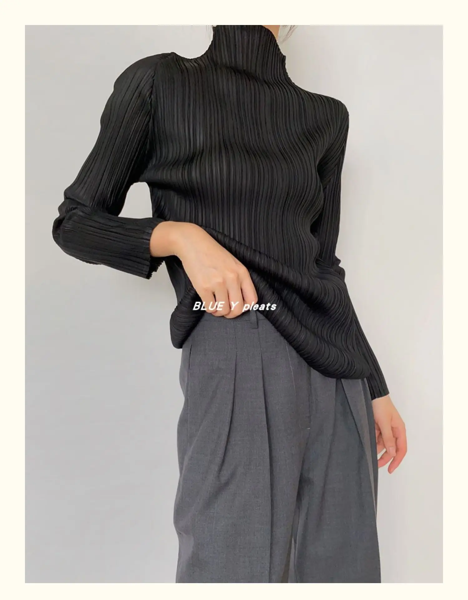 Miyake Pleated Women Shirt Tops High Fashion Designer New Aesthetic Clothing Comfortable Causal Long Sleeve Turtleneck T-shirt