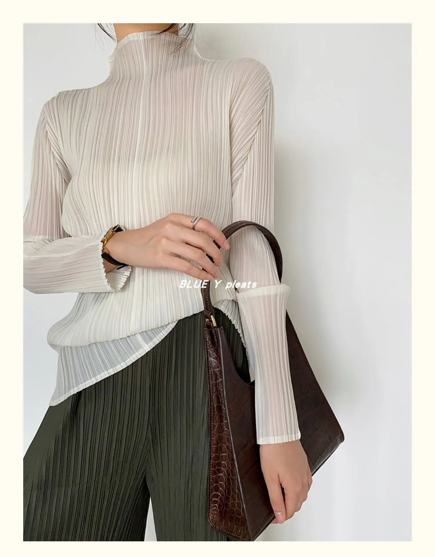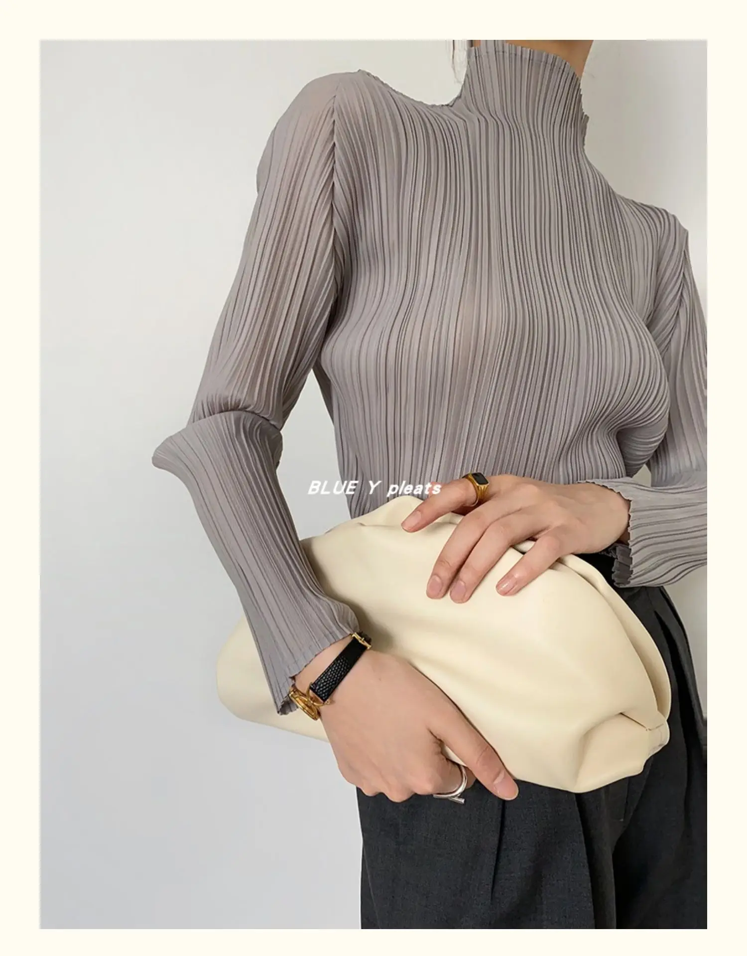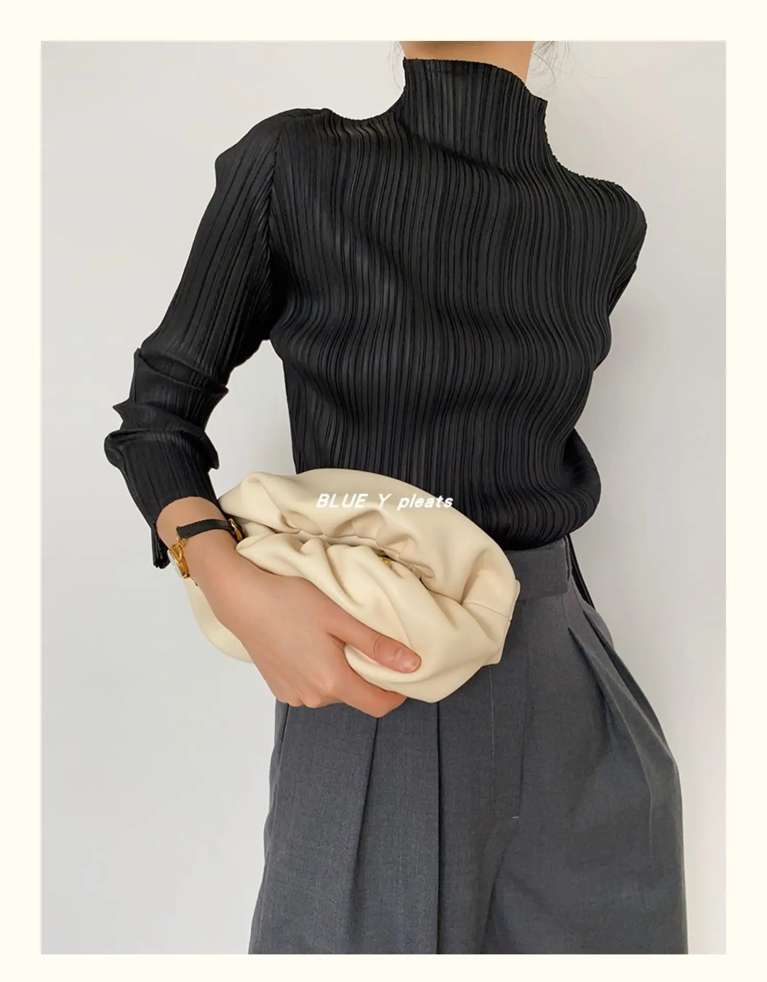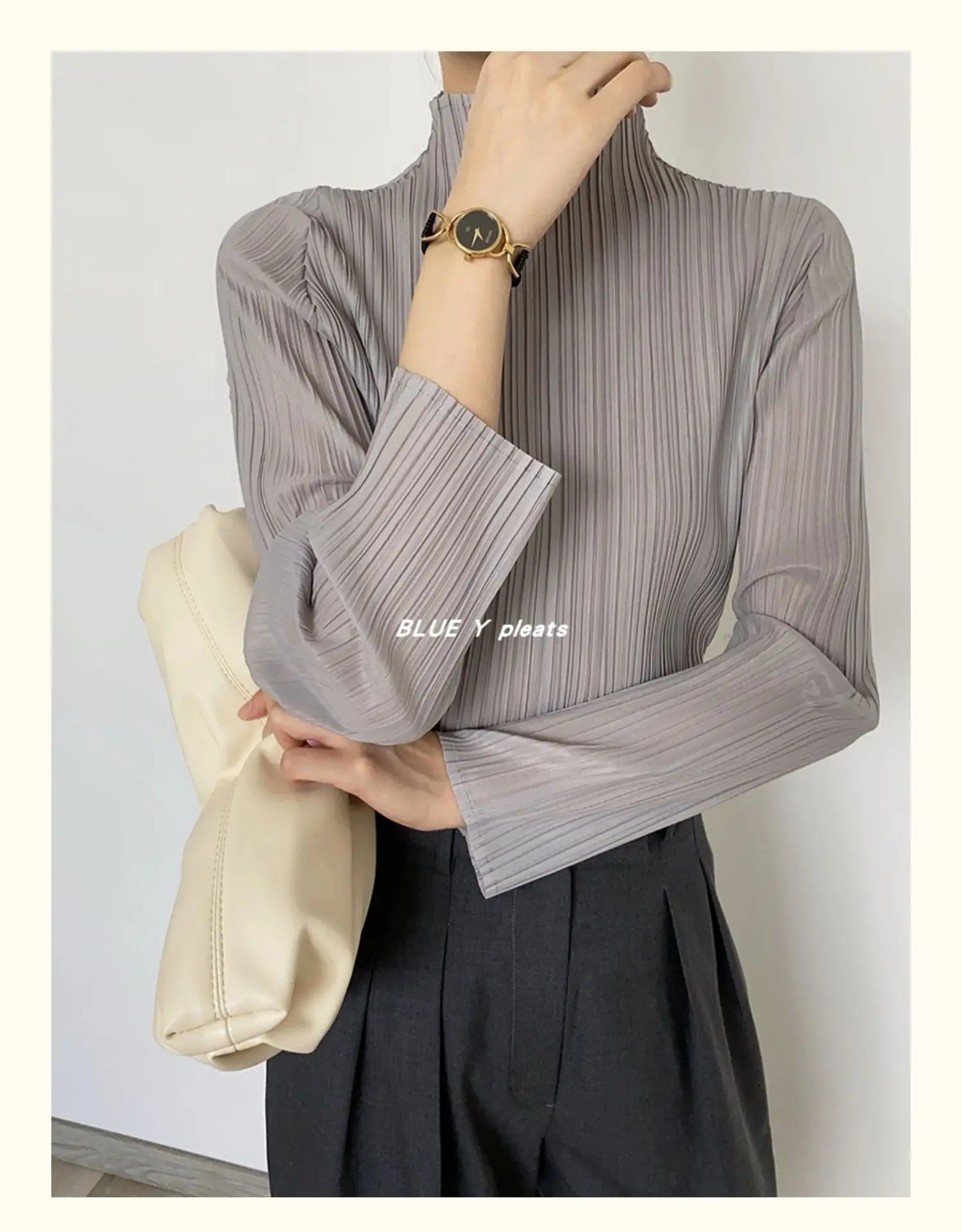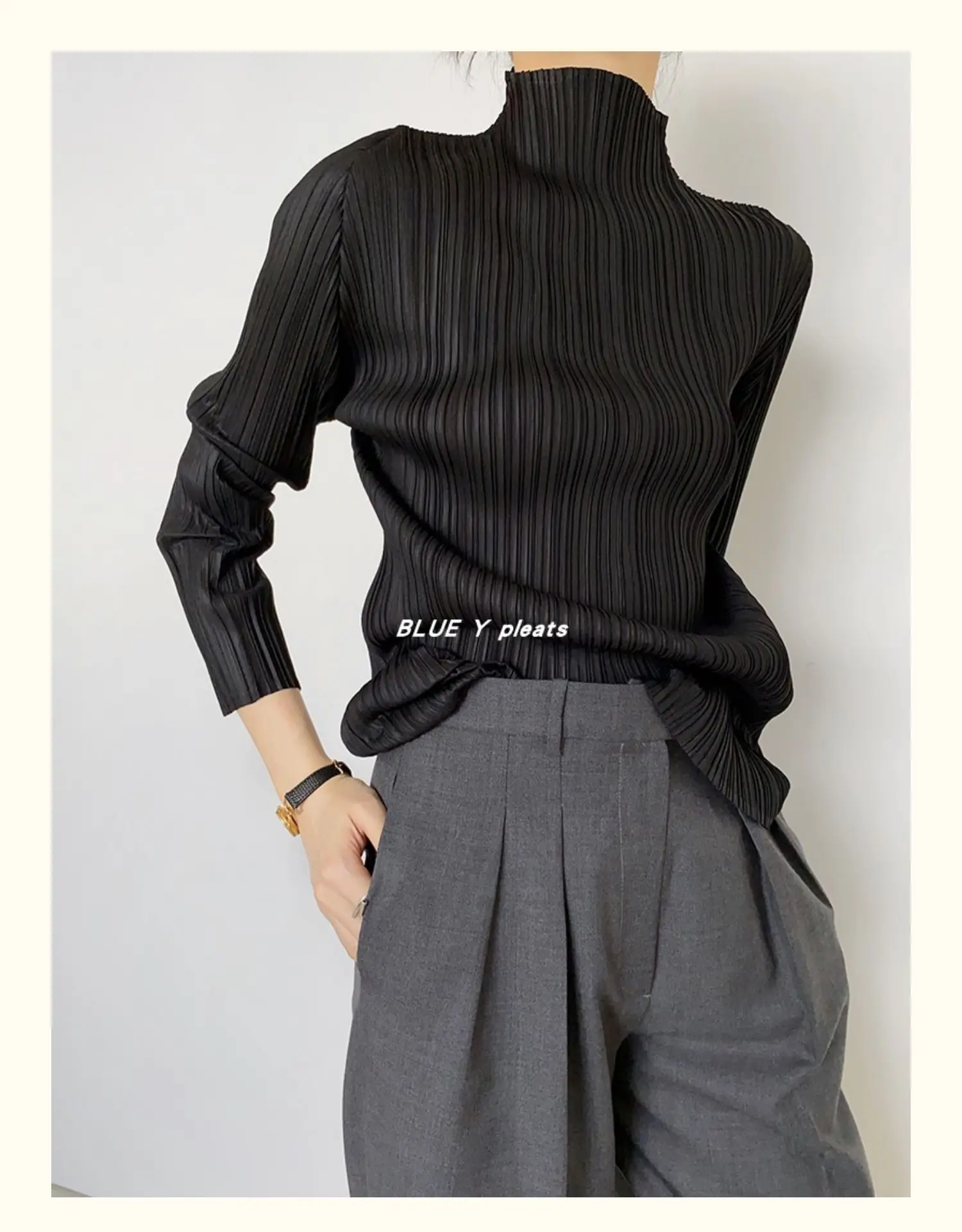 Miyake Pleated Women Shirt Tops High Fashion Designer New Aesthetic Clothing Comfortable Causal Long Sleeve Turtleneck T-shirt