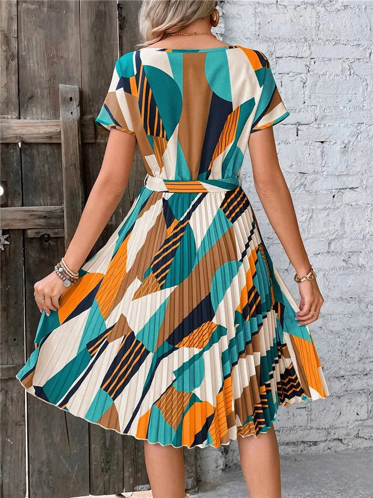 Msfilia Summer Print Pleated A Line Long Dress Women Short Sleeve High Waist Spring Round Neck Chic Dress with Belt