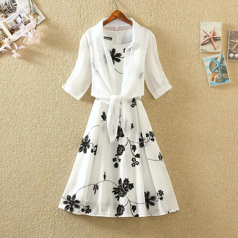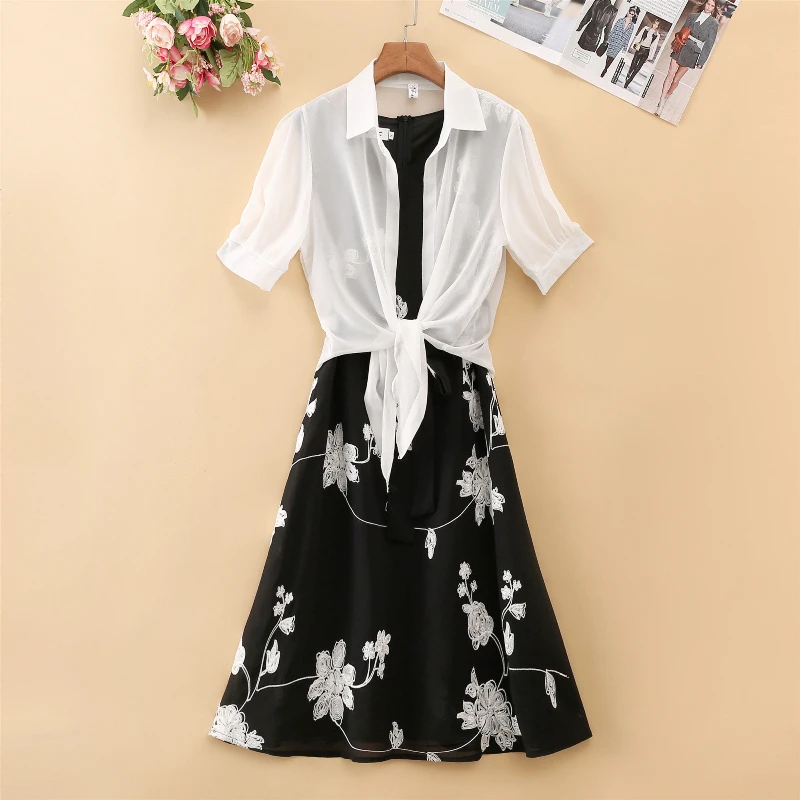 New Elegant Suit Two-piece Dress High Waist Sleeveless Slim A-line Skirt Floral Embroidery White Top Bow Belt Vintage WOMEN