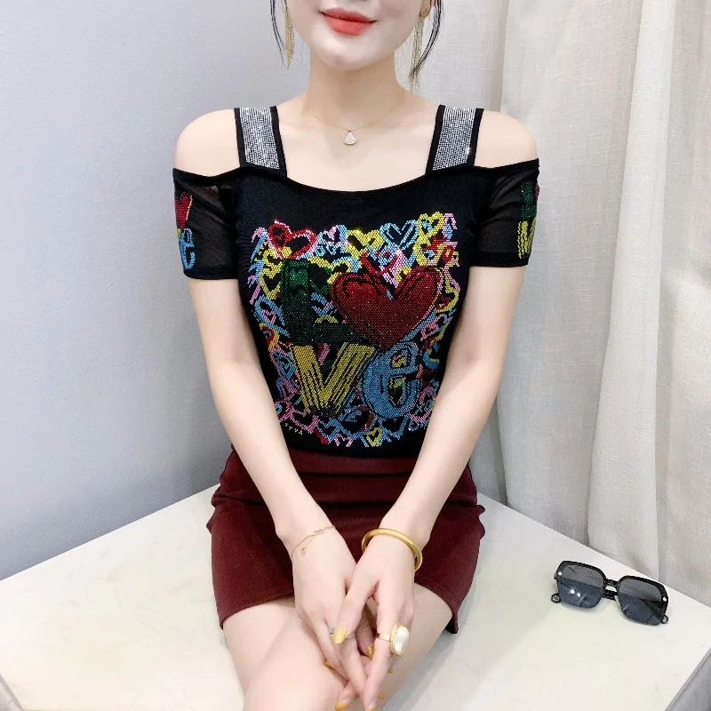 New European Clothes Women’s T-shirts Fashion Sexy Off Shoulder Hot Drill Mesh Tops Short Sleeve Summer Elastic Tee