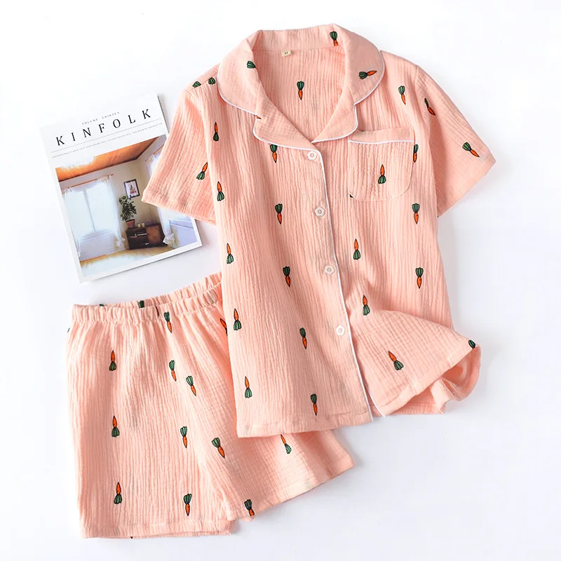 New ladies pajamas suit summer comfortable cotton gauze lapel pajamas suit women thin loose cartoon carrot printing home service