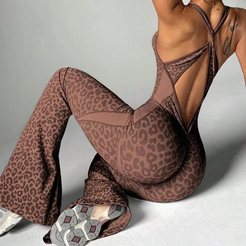 New Leopard Print Bodysuit Women Seamless Flared Pants Jumpsuits Sexy One-piece Fitness Suit Cross Back Stretchy Yoga Jumpsuits